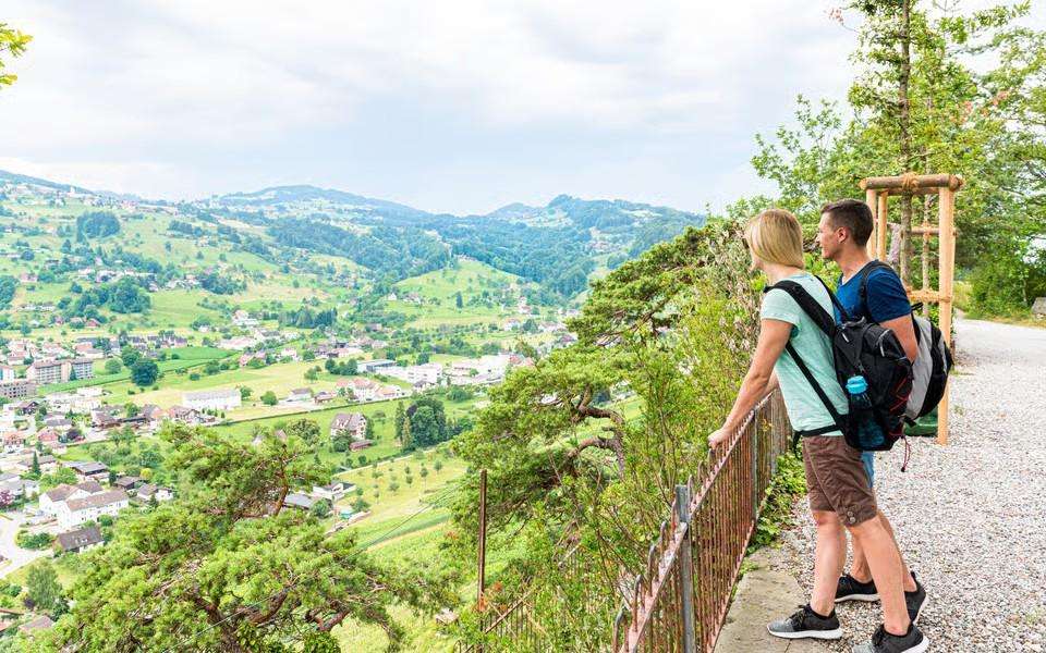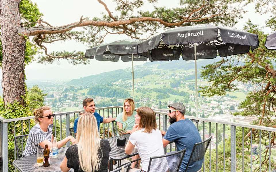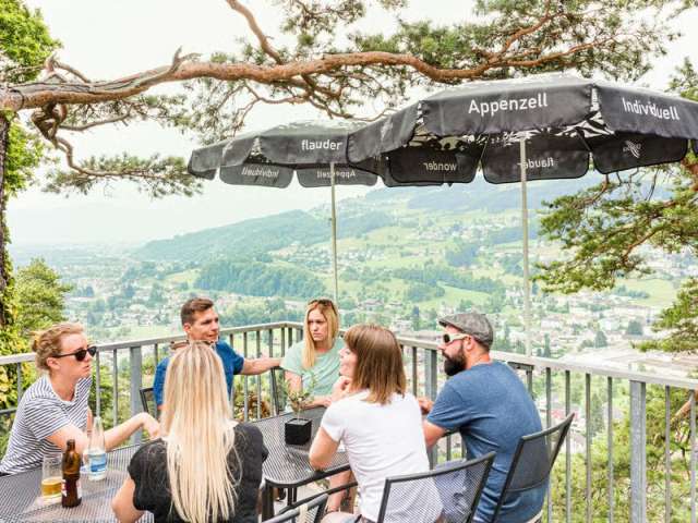 After the first stage across flowering meadows and through shady forests, the Restaurant Bären serves you a hearty starter of Gruber specialties. With newfound energy, you make your way up to the Fünfländerblick vantage point. Enjoy the spectacular view over Lake Constance and five countries: Switzerland, Austria and the former independent states of Baden, Württemberg and Bavaria. The hike continues to the Treichli restaurant, which offers a real classic, garnished with a breathtaking view of Lake Constance. Now it's time to descend to the Steiniger Tisch excursion destination, where a well-earned dessert awaits you with the best views over the Thal vineyards. The last stage ends at Rheineck railroad station, where the S-Bahn will take you back to St.Gallen in comfort. En Guätä!
