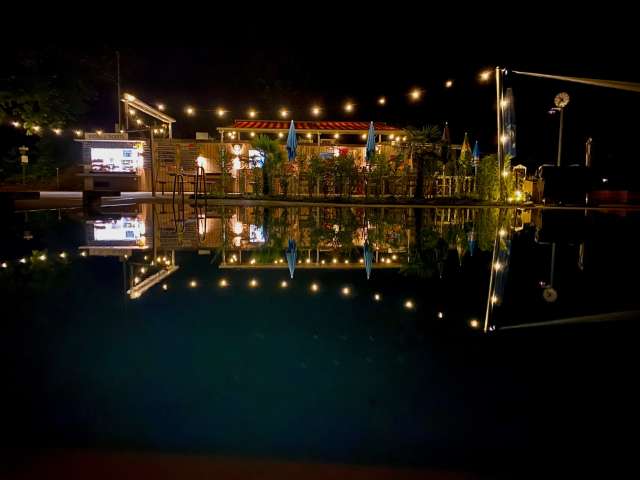 Swimming pool 16 m long, 4 lanes, small non-swimmers' pool, separate paddling pool with small paddling landscape, children's slide, diving facility 2 m high into the Rhine, playground with play equipment and barbecue area.