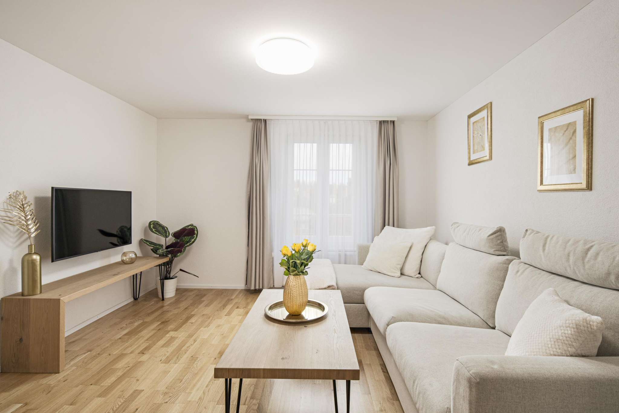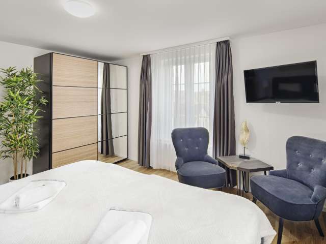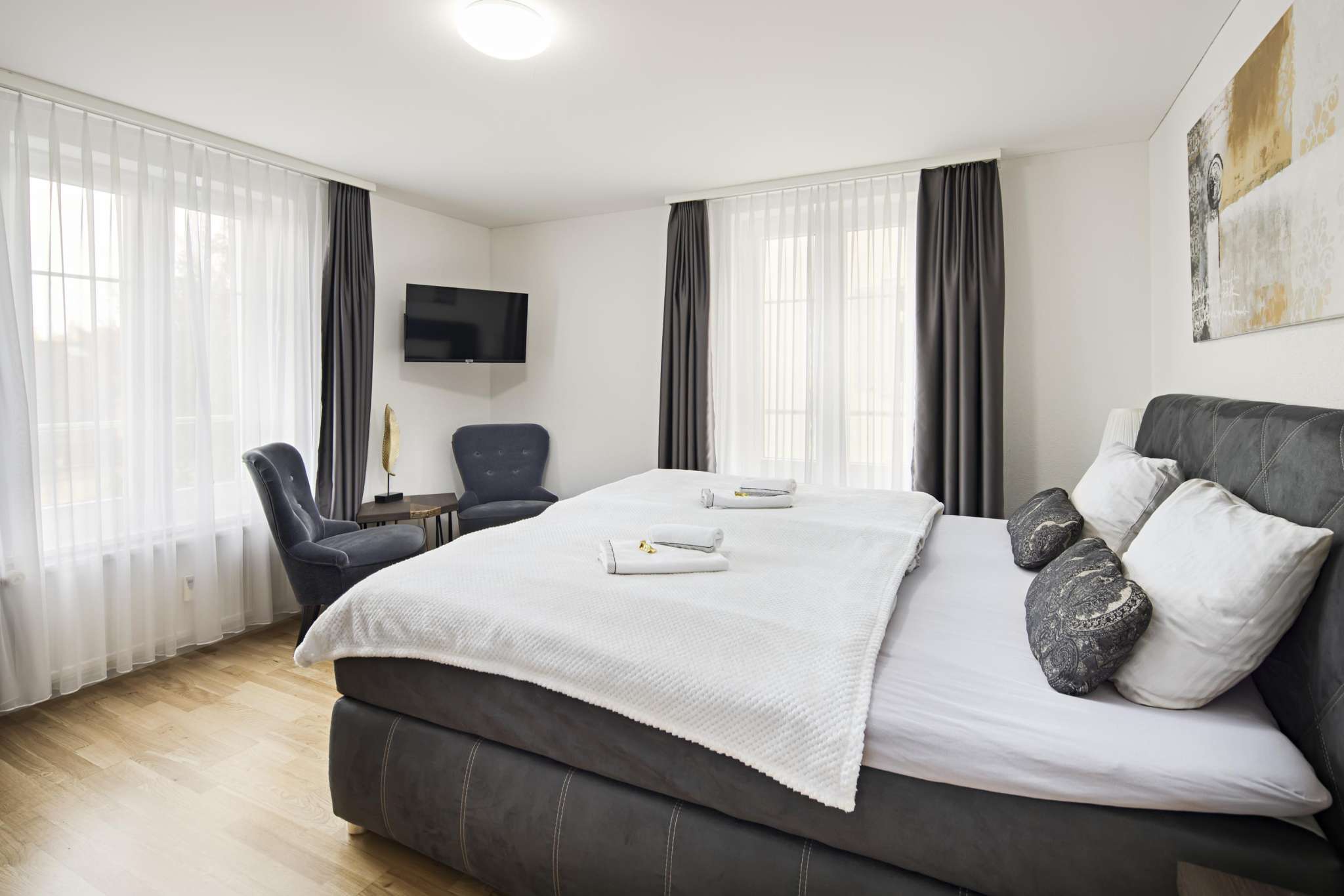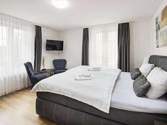 Inside the suite, guests can expect an elegant mix of modern design and elegant wooden furniture. The spacious bedroom with the king-size box-spring bed (180 x 200 cm) promises a restful night's sleep. In the cozy and attractively designed living room, the comfortable sofa set with integrated sofa bed with slatted frame (140 x 200 cm) provides a good night's sleep for two more people. The living room and bedroom are each equipped with a large smart TV with free Netflix and Sunrise TV subscription. The apartment has free Wi-Fi.