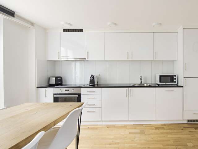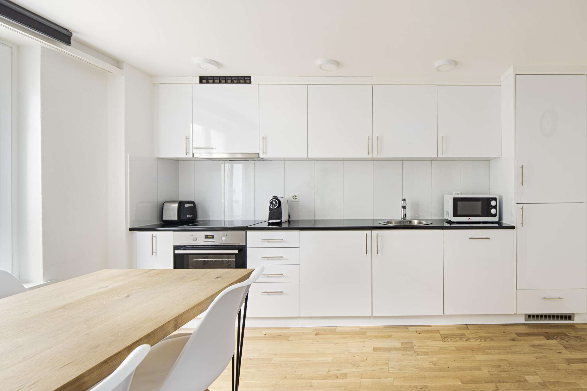 The suite's exclusive wood design continues in the dining area, which features a cozy dining table that encourages social dinners with friends. In the fully equipped kitchen with stove, dishwasher, refrigerator, freezer, coffee maker, plates, glasses and cutlery, guests are allowed to realize their culinary desires as they wish. The bright and clean bathroom has a large shower area, a washing machine as well as a dryer. Hand soap, shower gel, shampoo and fresh towels are provided.