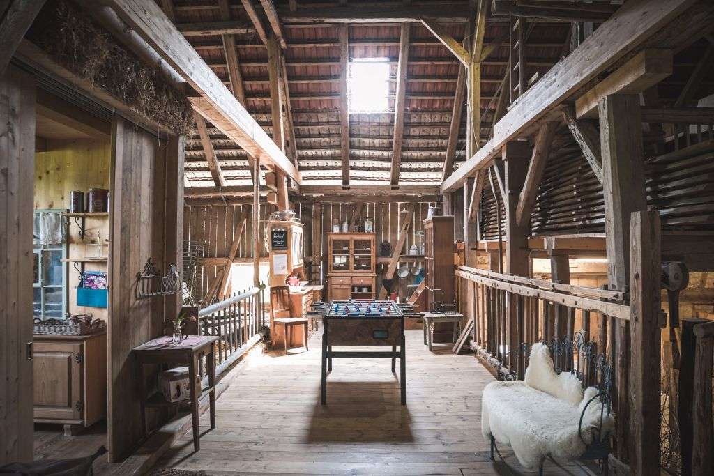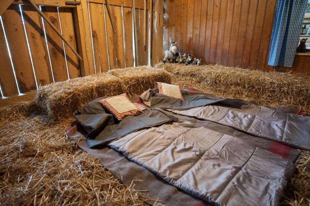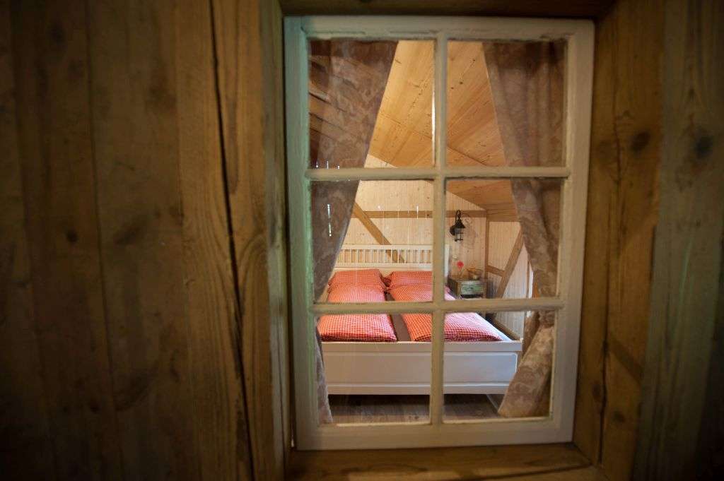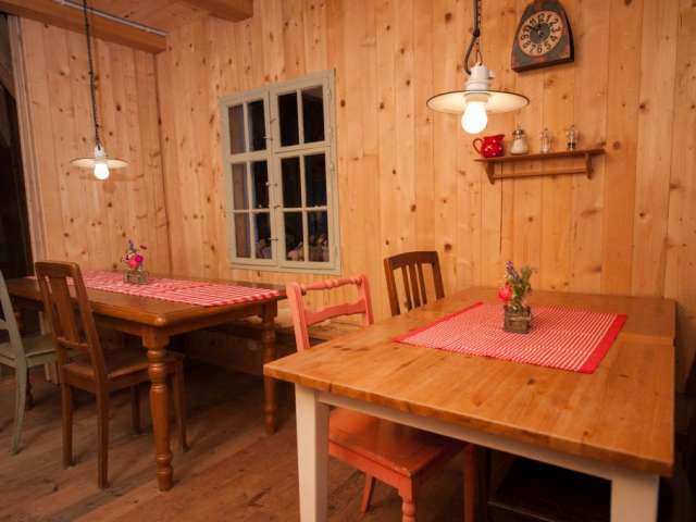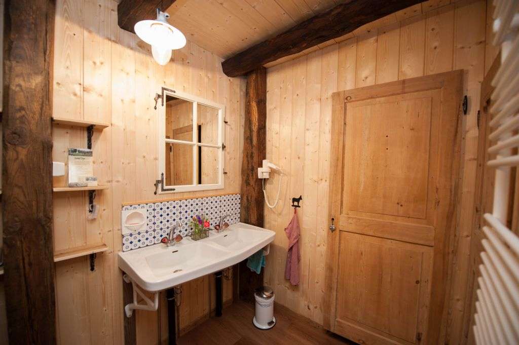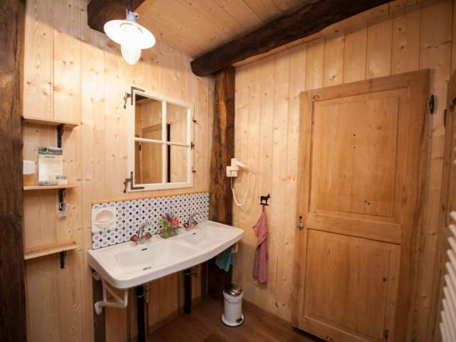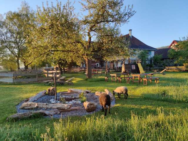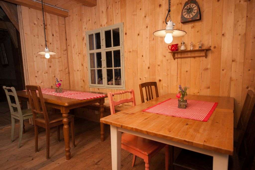 In the lovingly furnished rustic barn directly by the stream, you will find the 4-bed room and the two straw rooms above the donkey stable in the hayloft. The room is heated and has good mattresses and a wardrobe.