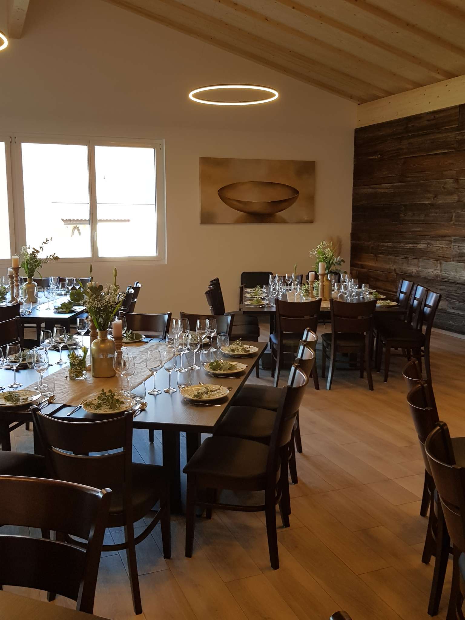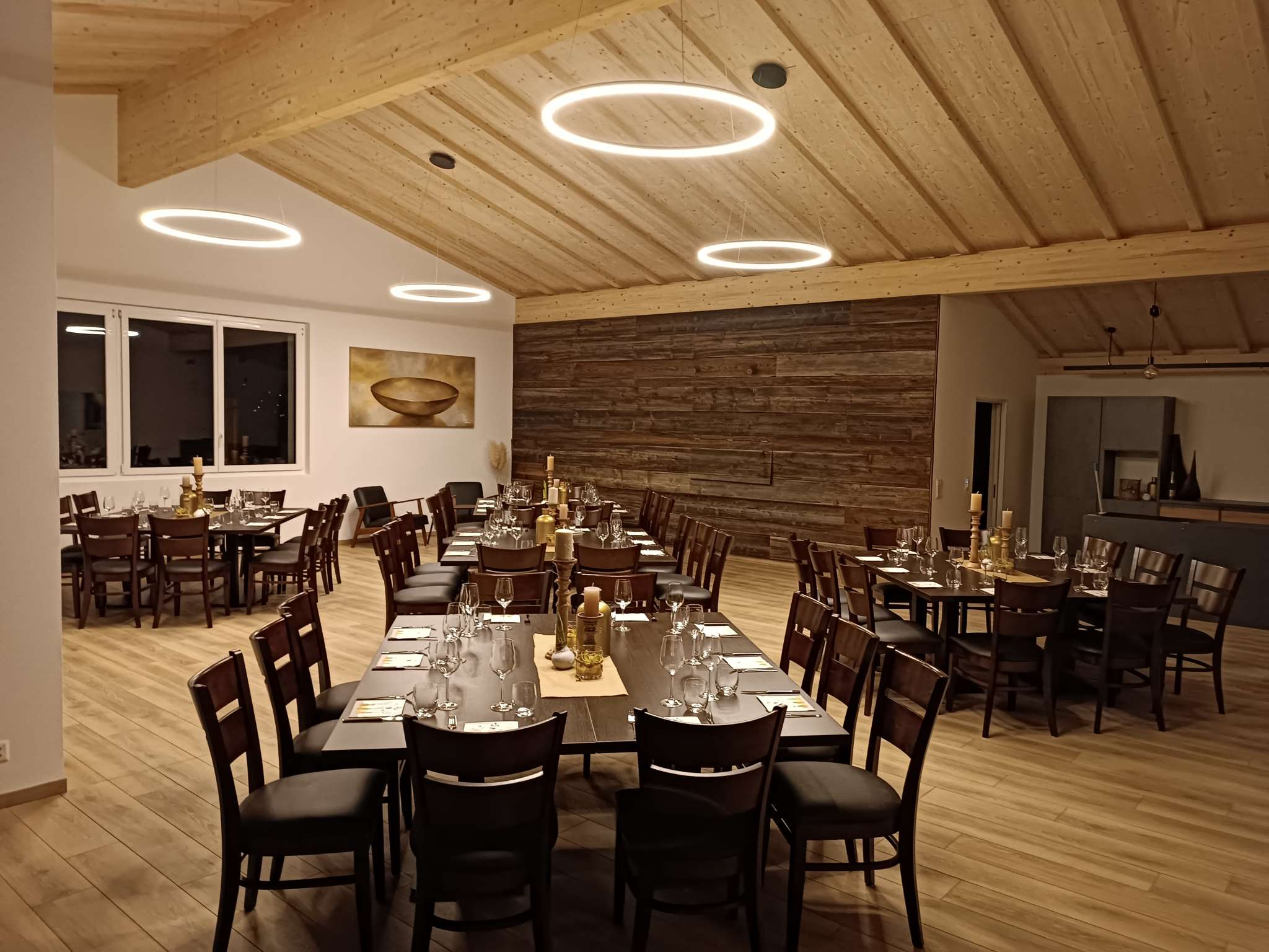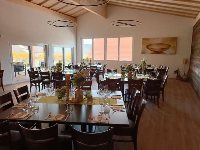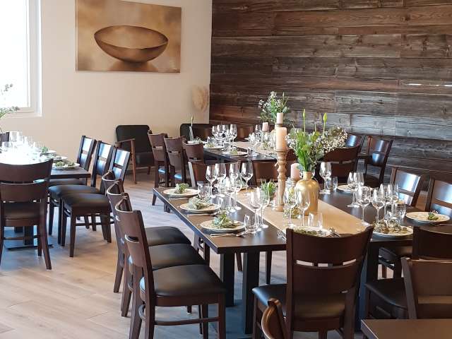 The modern event room at the Engels-Früchtehof offers space for up to 70 people. It has first-class equipment. Complete seating, generous tables, beamer wall with projector as well as crockery are available. For those who want to help themselves, there is a great catering kitchen equipped with buffet, induction hobs, plate warmer, gastro-steamer, fridge, dishwasher, refrigerated counter, coffee machine and a selection of drinks. An attractive covered outdoor terrace with a picturesque view of Untersee and Hohenklingen Castle invites you to take a break and enjoy. Lots of wood creates a cosy ambience. The Engel family offers vegetables and fruit from their own production for use in their farm shop. The third-generation family business is also happy to arrange an aperitif with a cold platter as well as decorations and floristry. On request, the Früchtehof can organise suitable catering with a regional party service. Guests are also free to bring their own catering.