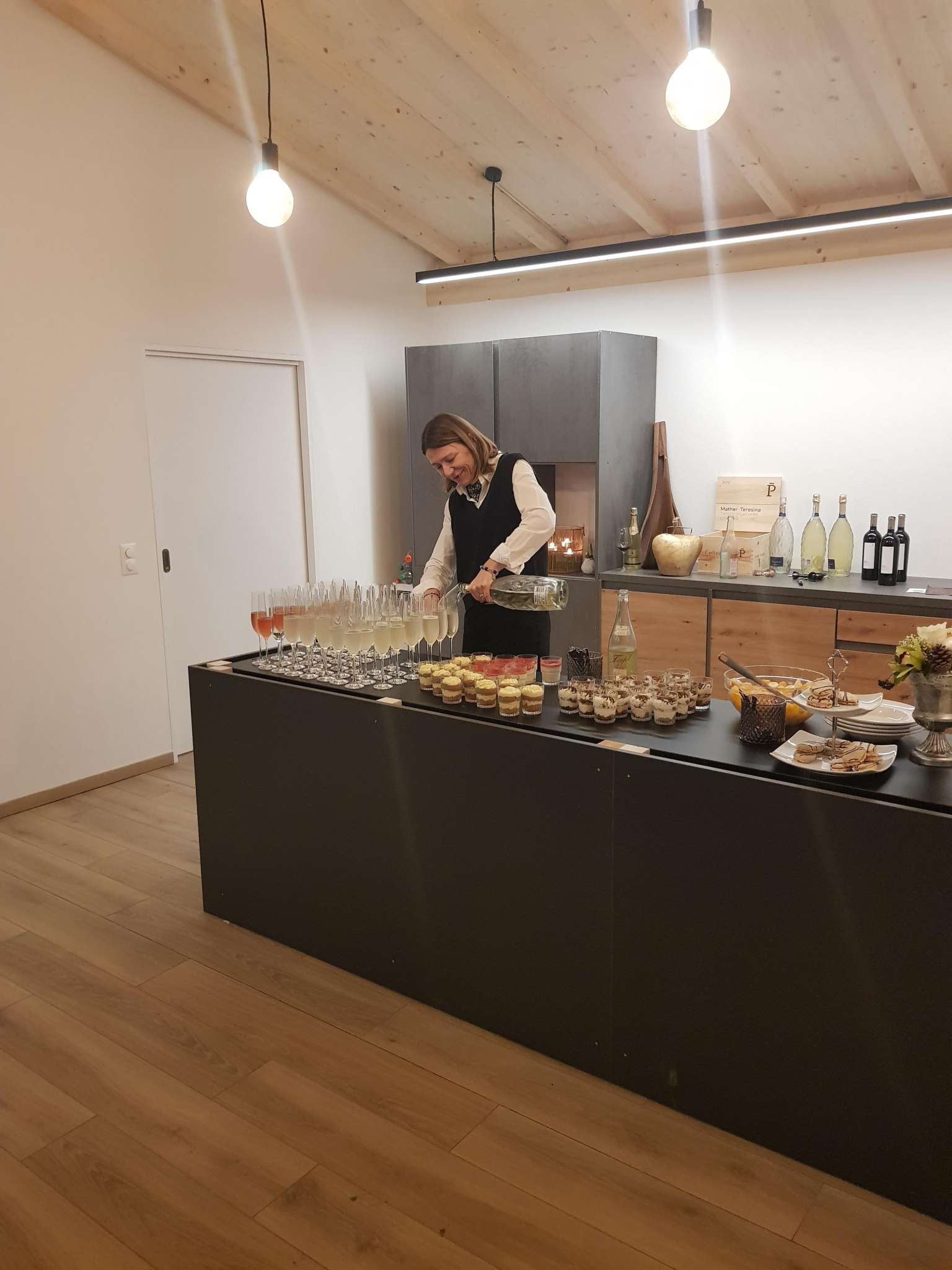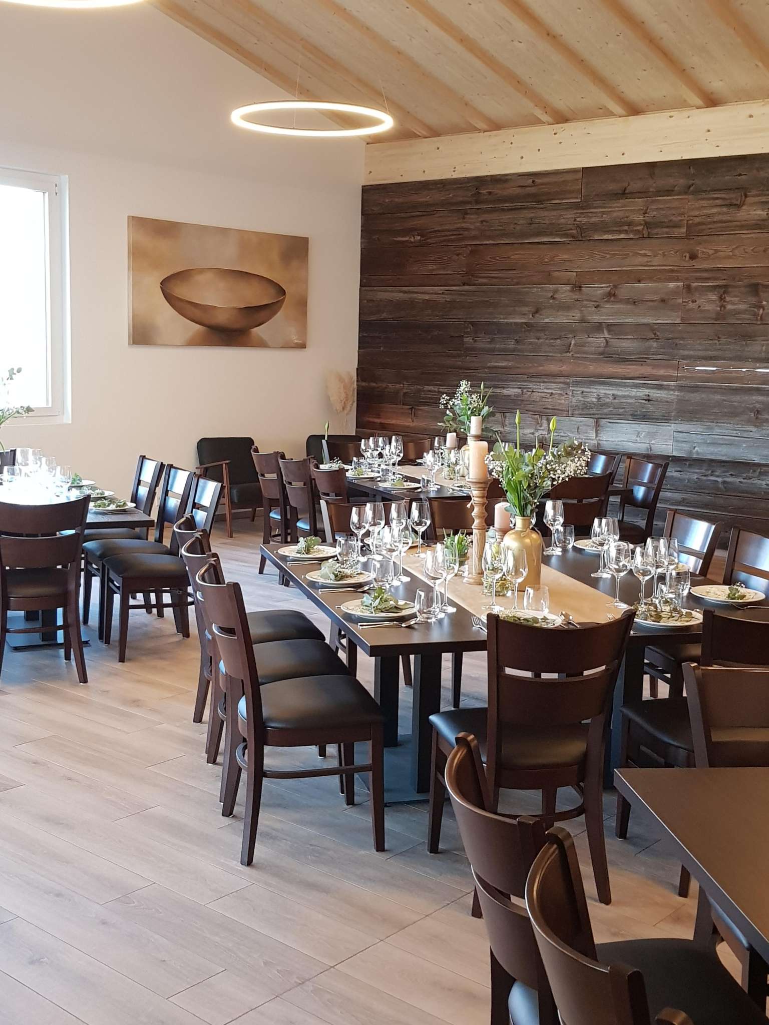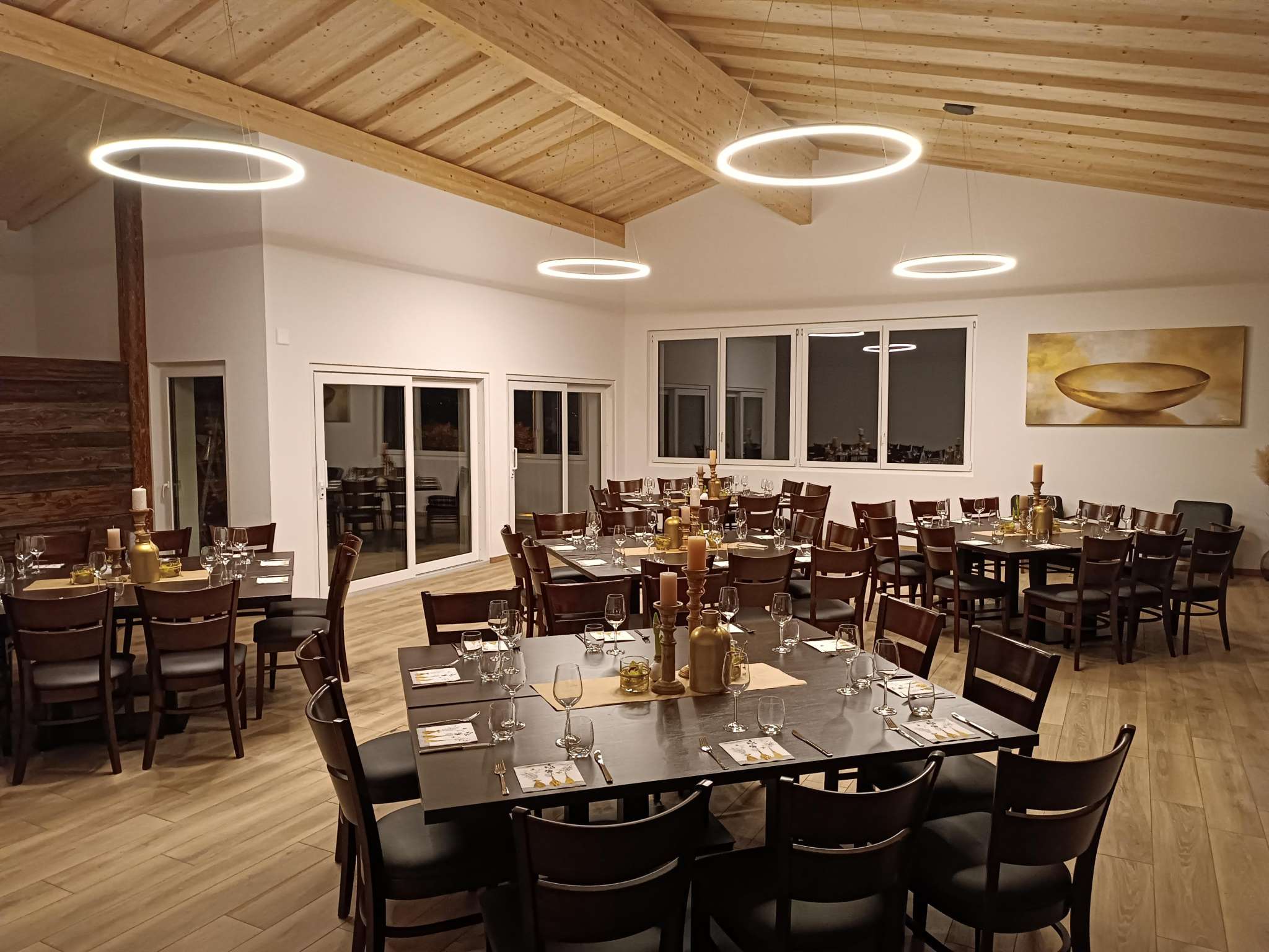 The modern event room at the Engels-Früchtehof offers space for up to 70 people. It has first-class equipment. Complete seating, generous tables, beamer wall with projector as well as crockery are available. For those who want to help themselves, there is a great catering kitchen equipped with buffet, induction hobs, plate warmer, gastro-steamer, fridge, dishwasher, refrigerated counter, coffee machine and a selection of drinks. An attractive covered outdoor terrace with a picturesque view of Untersee and Hohenklingen Castle invites you to take a break and enjoy. Lots of wood creates a cosy ambience. The Engel family offers vegetables and fruit from their own production for use in their farm shop. The third-generation family business is also happy to arrange an aperitif with a cold platter as well as decorations and floristry. On request, the Früchtehof can organise suitable catering with a regional party service. Guests are also free to bring their own catering.