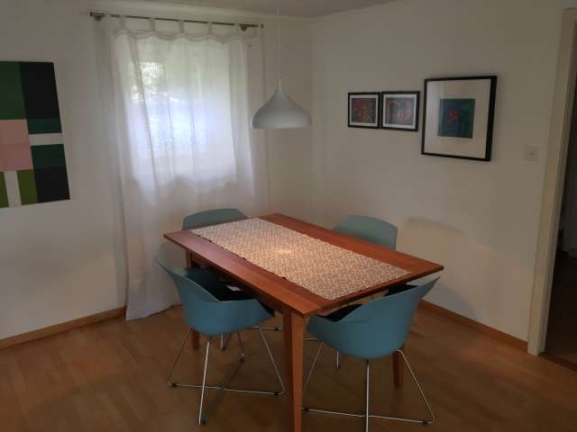 This small, lovingly kept house is situated in Neuhausen am Rheinfall. It is within close vicinity of the forest, and it's a 2 minute walk to the bus stop and German train station, the outdoor swimming pool, and to the nearest shops.