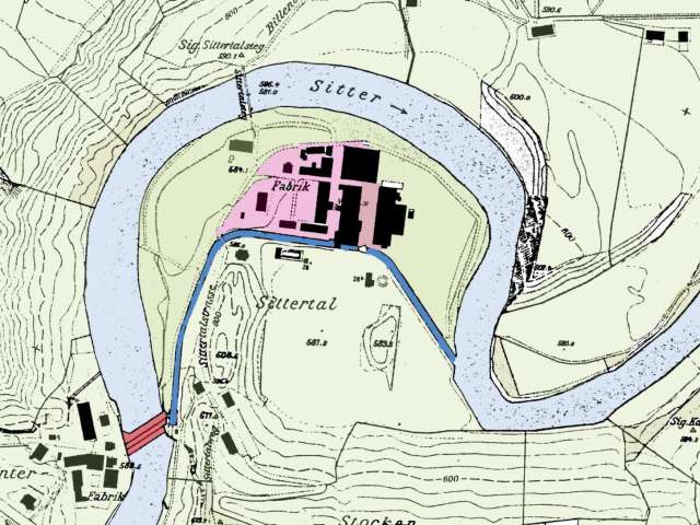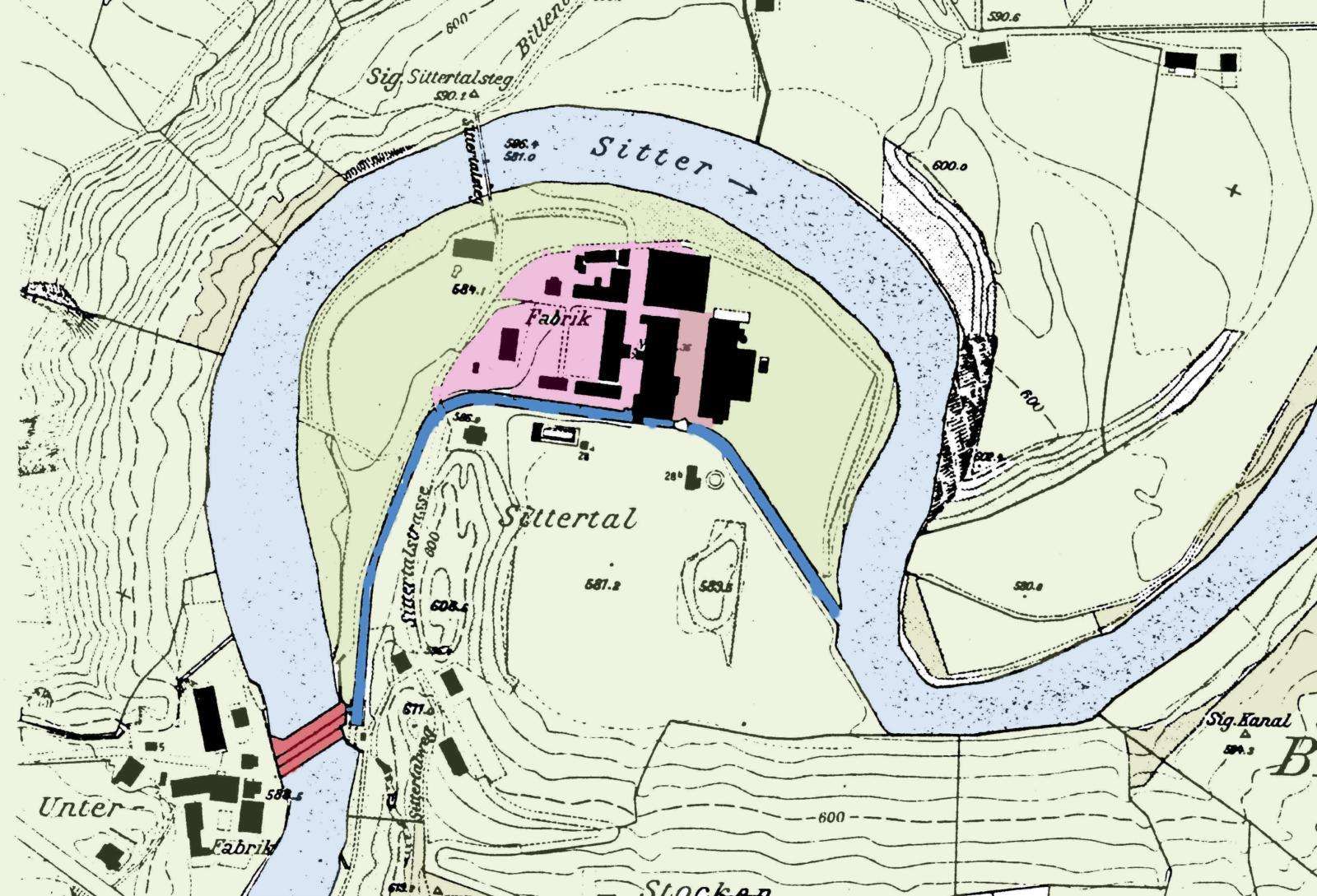 The factory and building complexes of the former Sitterthal dye works are characterized by one structural element: the canal. In the first construction phase in 1840, this harnessed the water power of the River Sitter. The first factory building was erected at right angles to the canal, which meant that the entire length of the hall could be served directly by a transmission system. All subsequent buildings and conversions were based on this grid - even when the water power had long since ceased to be used.