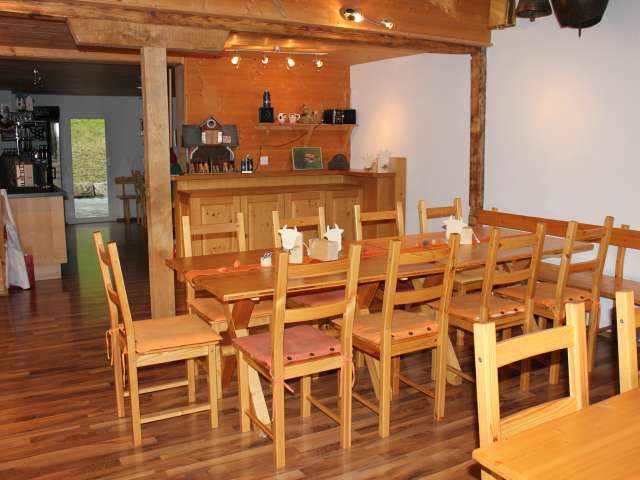 The cozy holiday home is comfortably furnished with lots of wood. The walls in the living room and bedroom are paneled with wood.