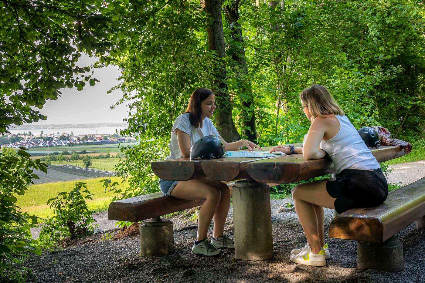 Barbecuing with a view? The Weiherholz fireplace in Roggwil offers a fabulous view of Lake Constance. Table and bench invite to a cozy get-together and linger. Wood is ready for firing. The shady forest is also ideal for a refreshing break from the bike tour.