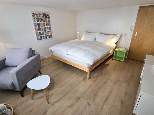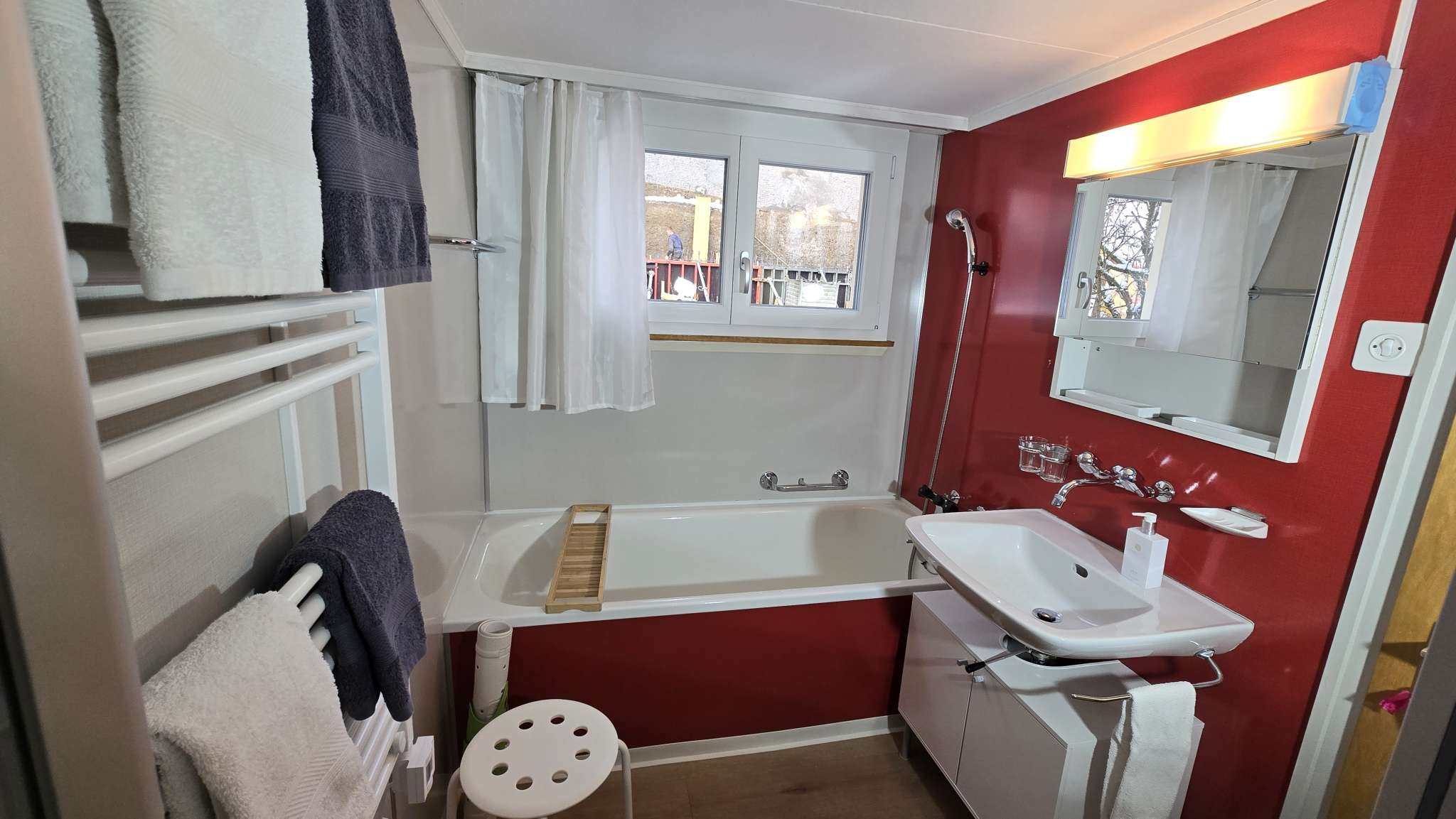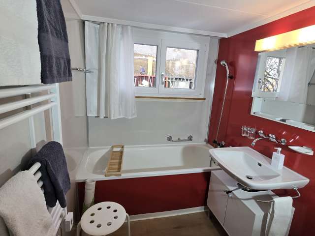 In addition to the four rooms, the holiday home has a kitchen equipped with three hotplates and an oven, Nespresso coffee machine, electric kettle, food processor, toaster, raclette oven, cheese grater, sauce strainer, refrigerator, dishwasher and the usual kitchen utensils.