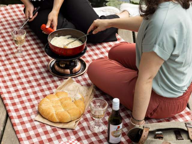 Find a cozy place outdoors, prepare the fondue (you will find instructions in the rucksack) and enjoy the delicious fondue.