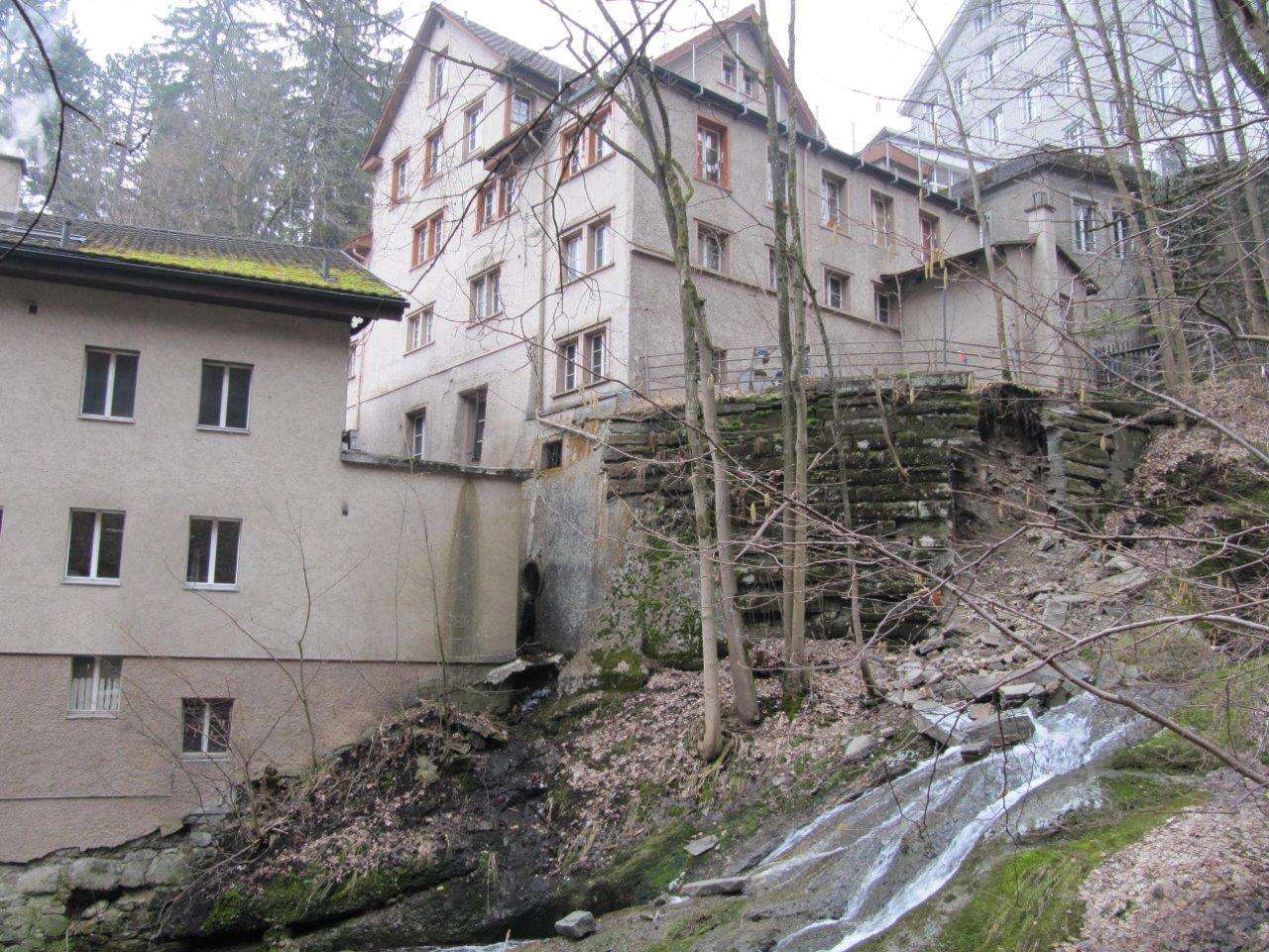 Since the 14th century, several mills have profited from the fall of the Steinach in the wild Mülenen gorge. The property at Mühlenstrasse 30 was one of them and in the 18th century was under the administration of the Stockamt, which supplied the needy from the church's offering box. In November 1800, the property was sold to the private miller Silvester Mittelholzer. After further changes of ownership, it passed to the finisher Jacob Hungerbühler in 1857. In a finishing mill, the raw fabrics were treated according to the customer's specifications, for example smoothed and starched, which required a lot of water. In 1873, the miller Franz Anton Köppel acquired the buildings and converted to steam power in 1883, enabling him to operate a pasta factory. Various producers successively took over the business until the last owner had to file for bankruptcy and the cantonal bank took over the property in 1937. The production conditions in the narrow Steinachtobel no longer met modern requirements.