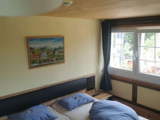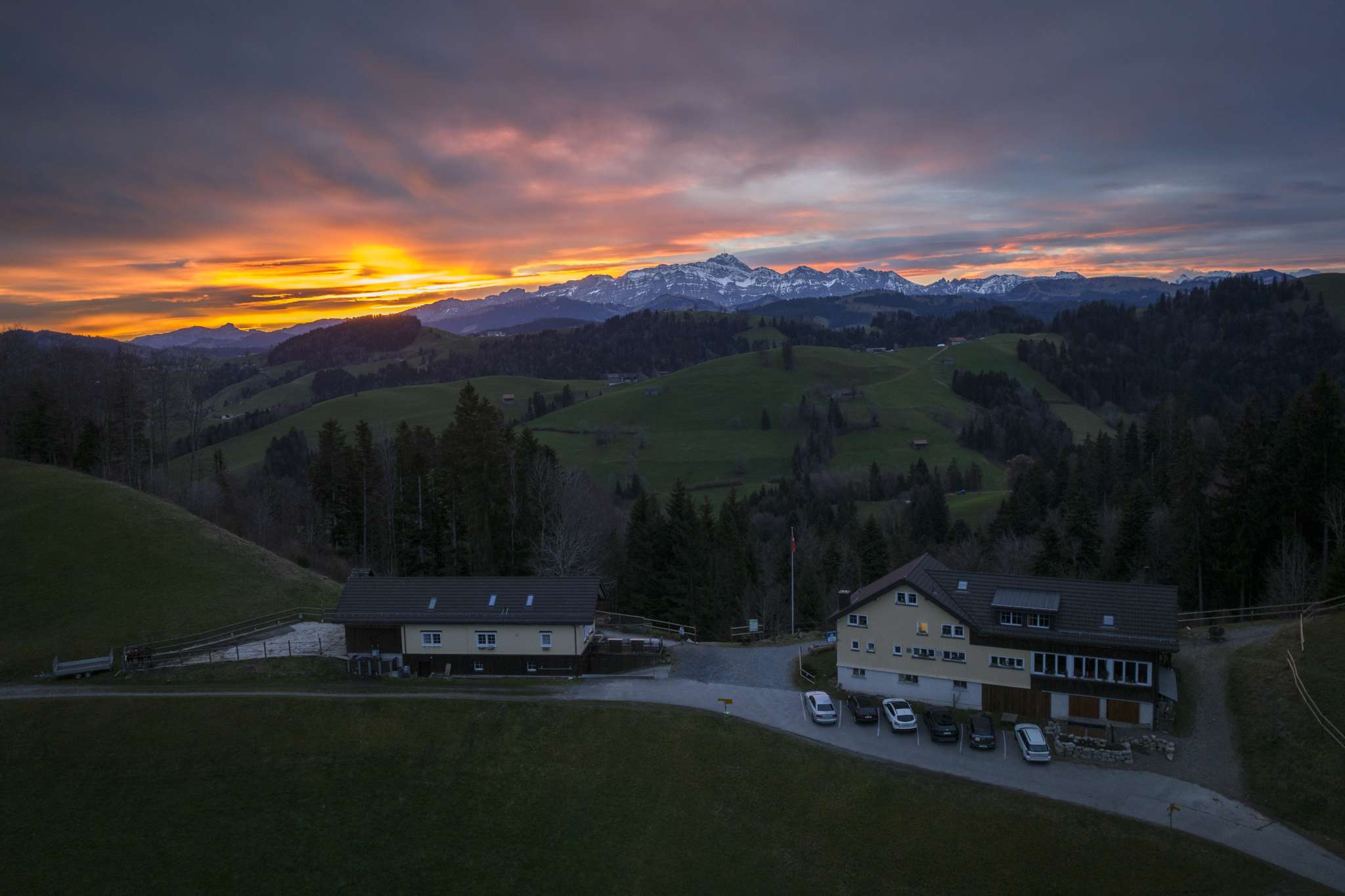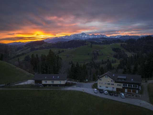 The inn is located on the edge of the Appenzellerland in Schwellbrunn, close to the border with Degersheim in St. Gallen. The view over the hilly landscape is magnificent, with the Alpstein massif and the Säntis to the south.