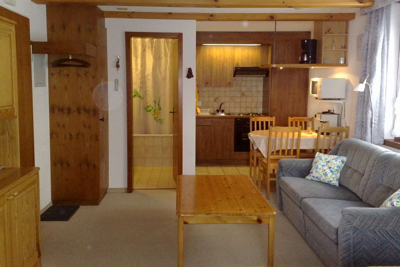 The apartment on the first floor is comfortably furnished with everything you need. Sleeping, living and dining area are one room and can accommodate 2 people. In summer, a seating area with fireplace is available.