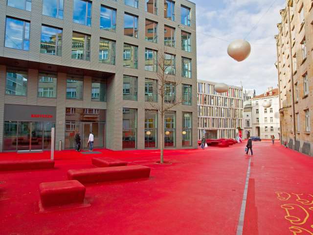 The large Roter Platz is dedicated to an art project designed by the artist Pipilotti Rist and architect Carlos Martinez. The square, also called the “Citylounge” is lined with sofas, chairs, tables, lounge chairs and even a Porsche which are all covered in a spongy red carpet to create a giant lounge in the public space.