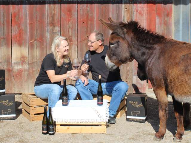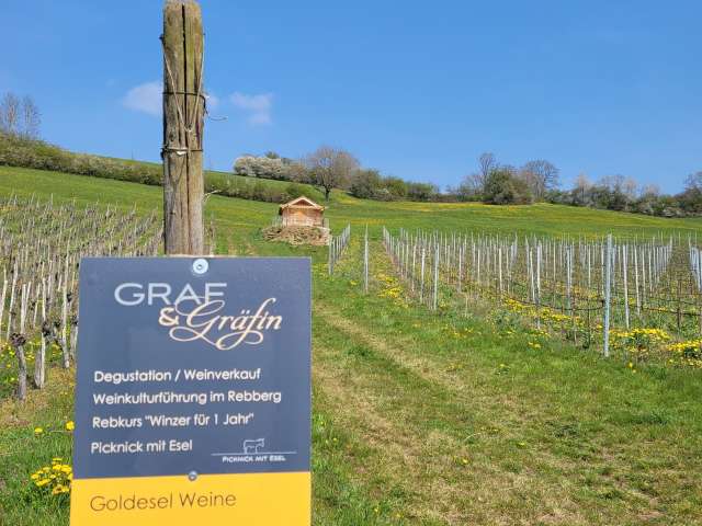 At "Wine with Donkey" you will go on a walk with us and our donkeys through the Oberhallau vineyard landscape and learn all kinds of things about the vineyard work and visit the variety garden. Finally, you can enjoy the golden donkey wines at the vineyard cottage with a beautiful view.