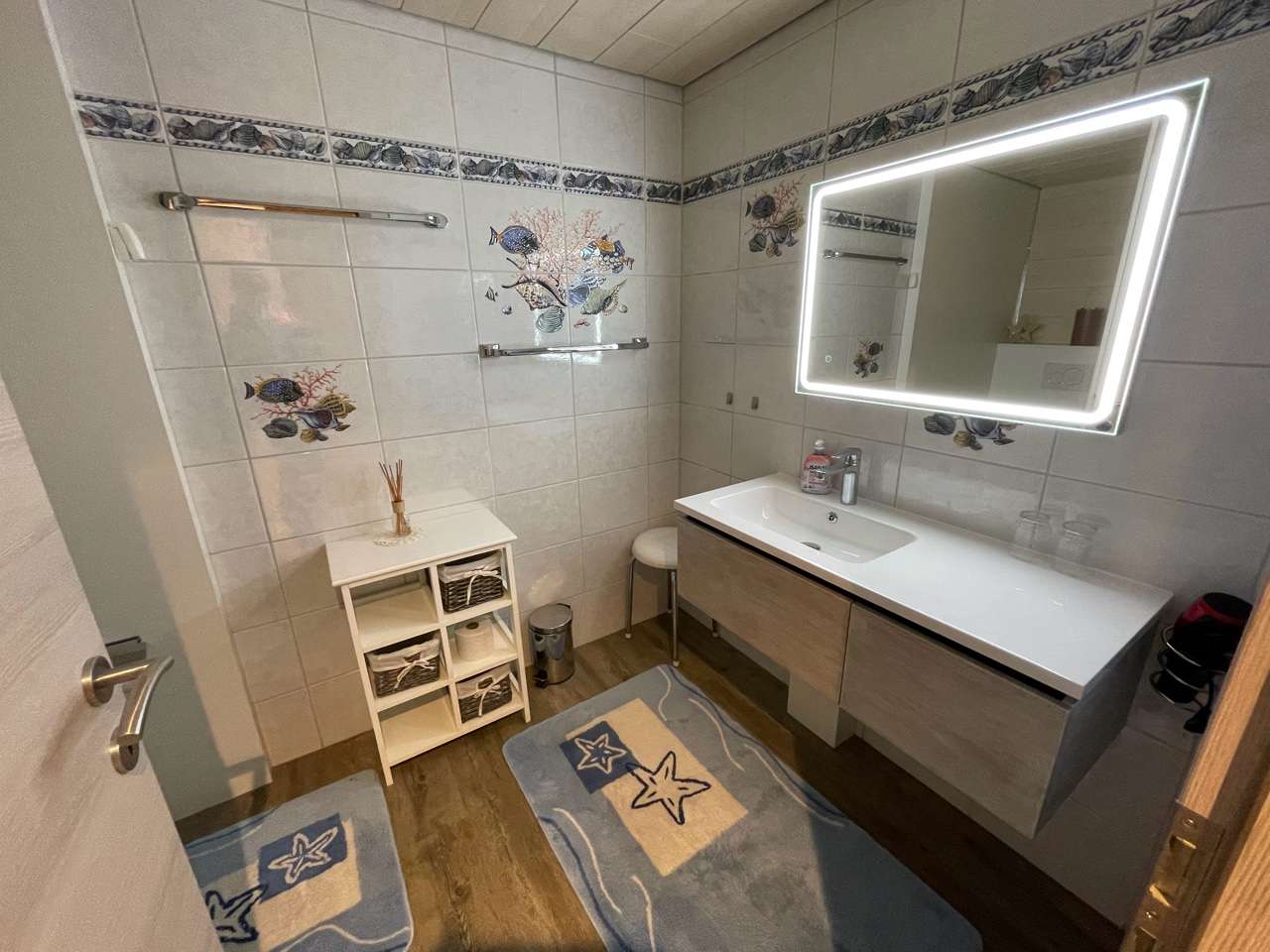Ideally suited for families, pensioners or business travellers. Situated at the edge of the village, the holiday apartment has a separate entrance accessed via the winding stairs to the basement. There, you enter the spacious entrance hall. The modern, open-plan kitchen with dishwasher adjoins the living room, with sliding doors giving onto a large balcony. The shower room features a shower, toilet and washbasin. A choice of three bedrooms is available: one parents’ bedroom with two 90-cm-wide mattresses, one bedroom with a 160-cm-wide bed and en suite shower room (toilet, washbasin and shower) as well as a smaller children's room with bunkbed and 2 190 x 80 cm mattresses. Guests can play and relax on the lawn one storey below the apartment. A washing machine and tumble dryer are also available.