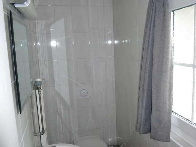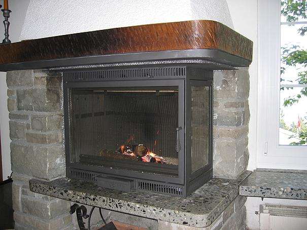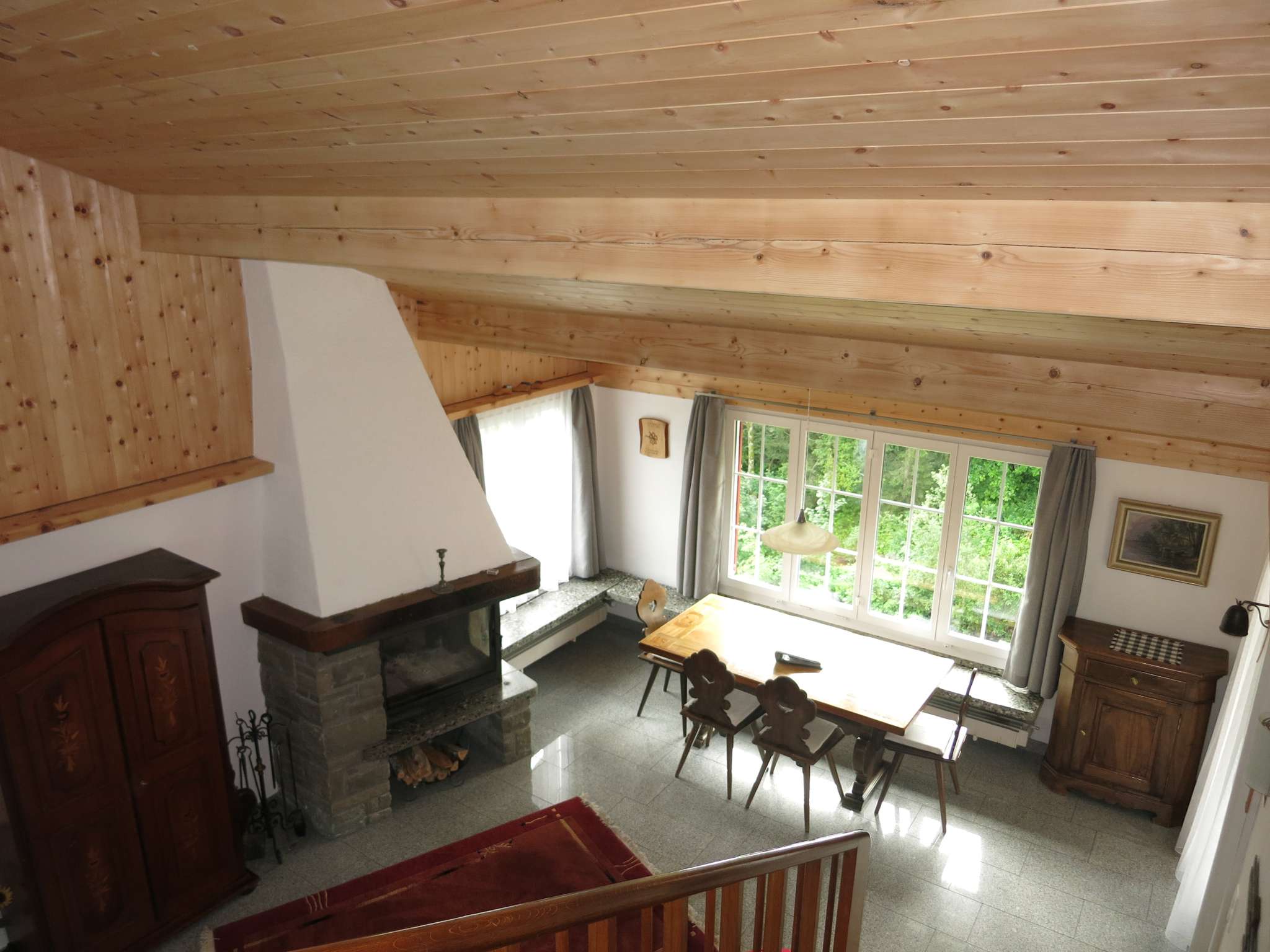 The apartment is cozy and furnished with lots of wood. The walls and ceilings are partly paneled with wood. The fire place in the living/dining room makes the atmosphere cozy.