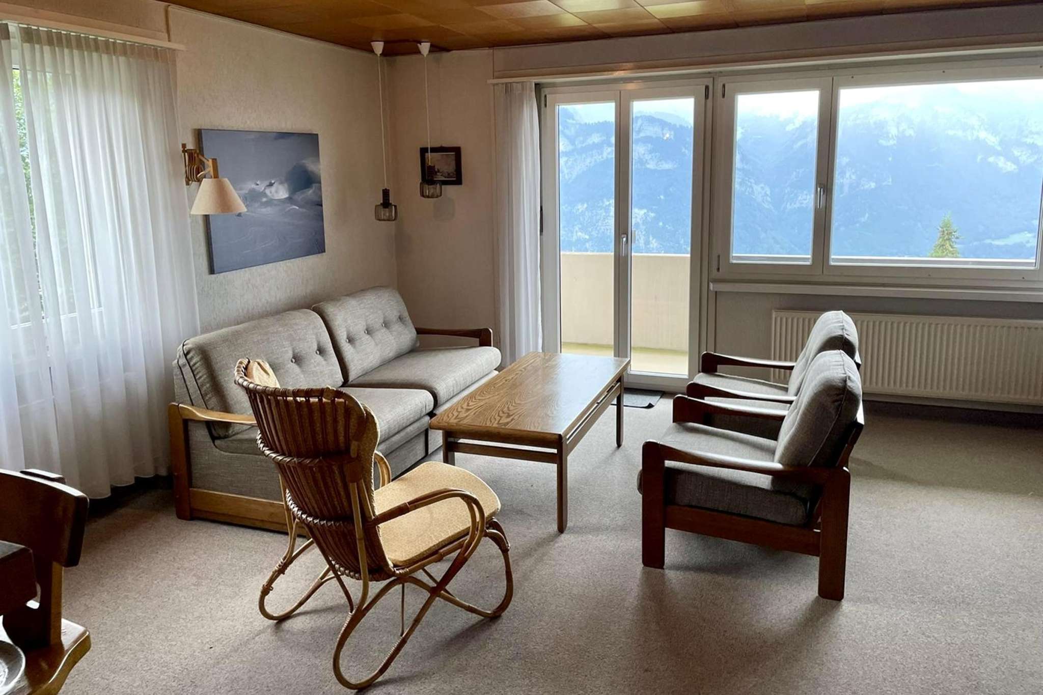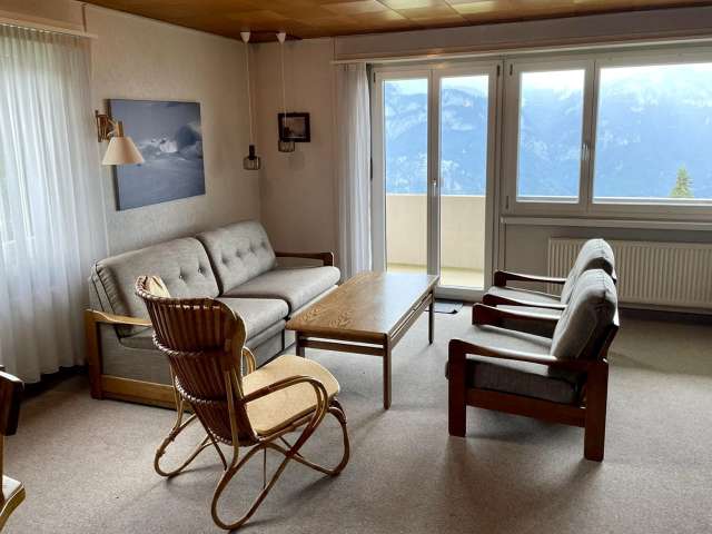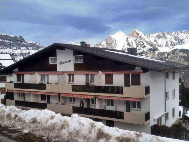 The three-room apartment in Flumserberg Tannenheim offers a beautiful view of the Churfirsten and is located near the Prodalp-Express cable car. It features two balconies and a free garage space.