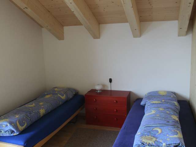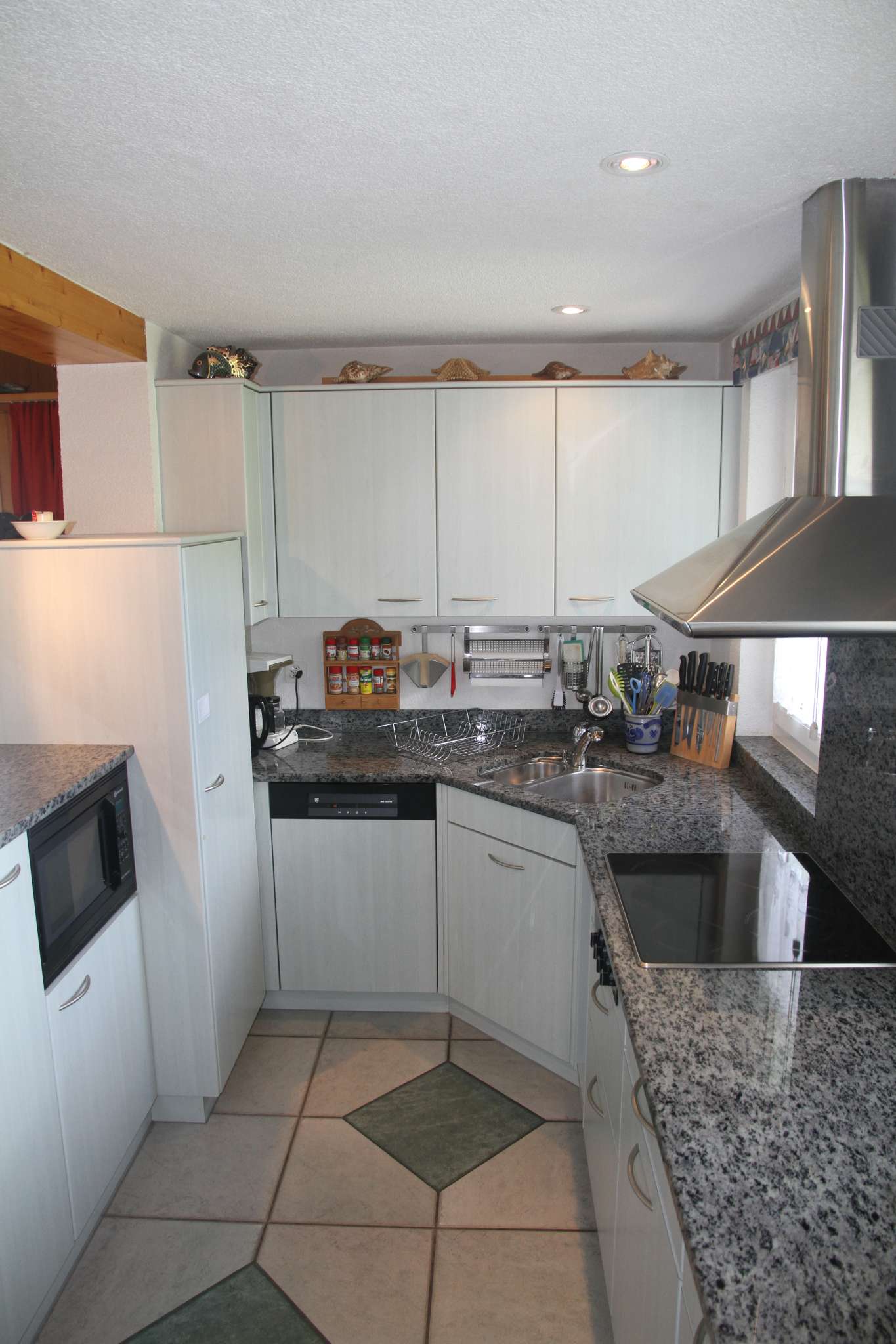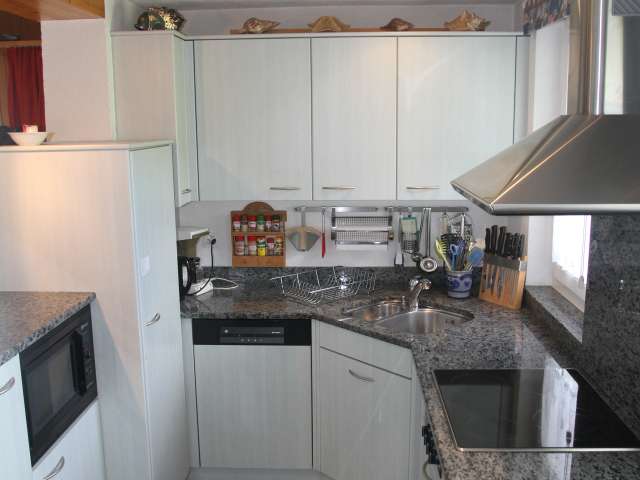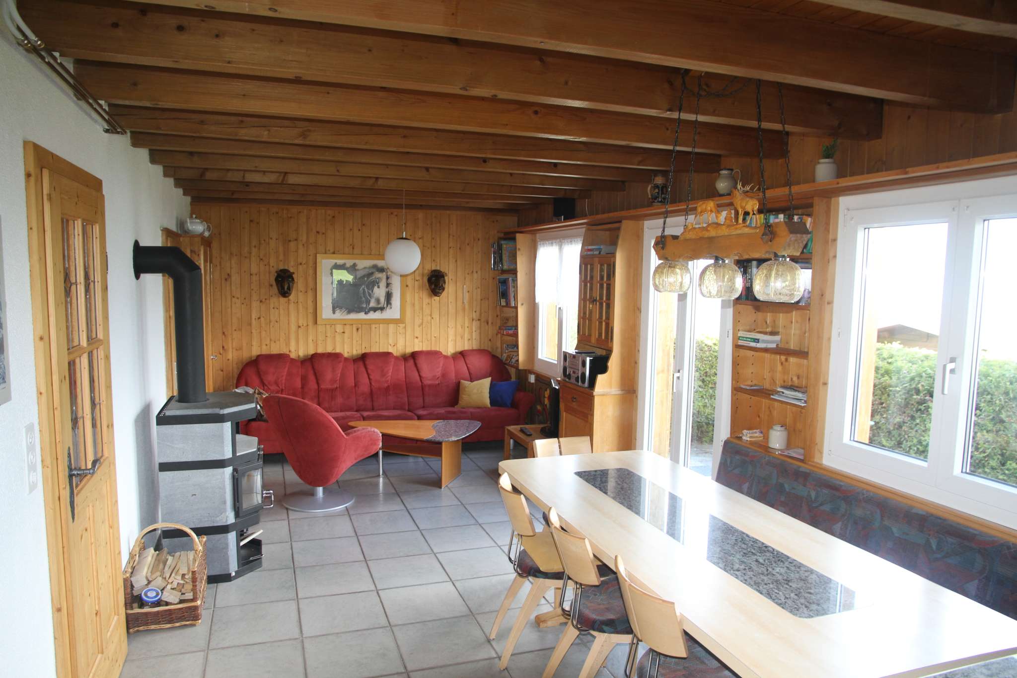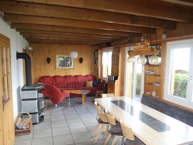 On the first floor there is another bedroom with a double bed. There is also a baby cot available. Bed linen is available on request. In the living room there is a Swedish stove (wood in the cellar), a radio and a TV. The large kitchen is fully equipped (fondue, raclette, etc.) and has a dishwasher, a fully automatic coffee machine and a large refrigerator.