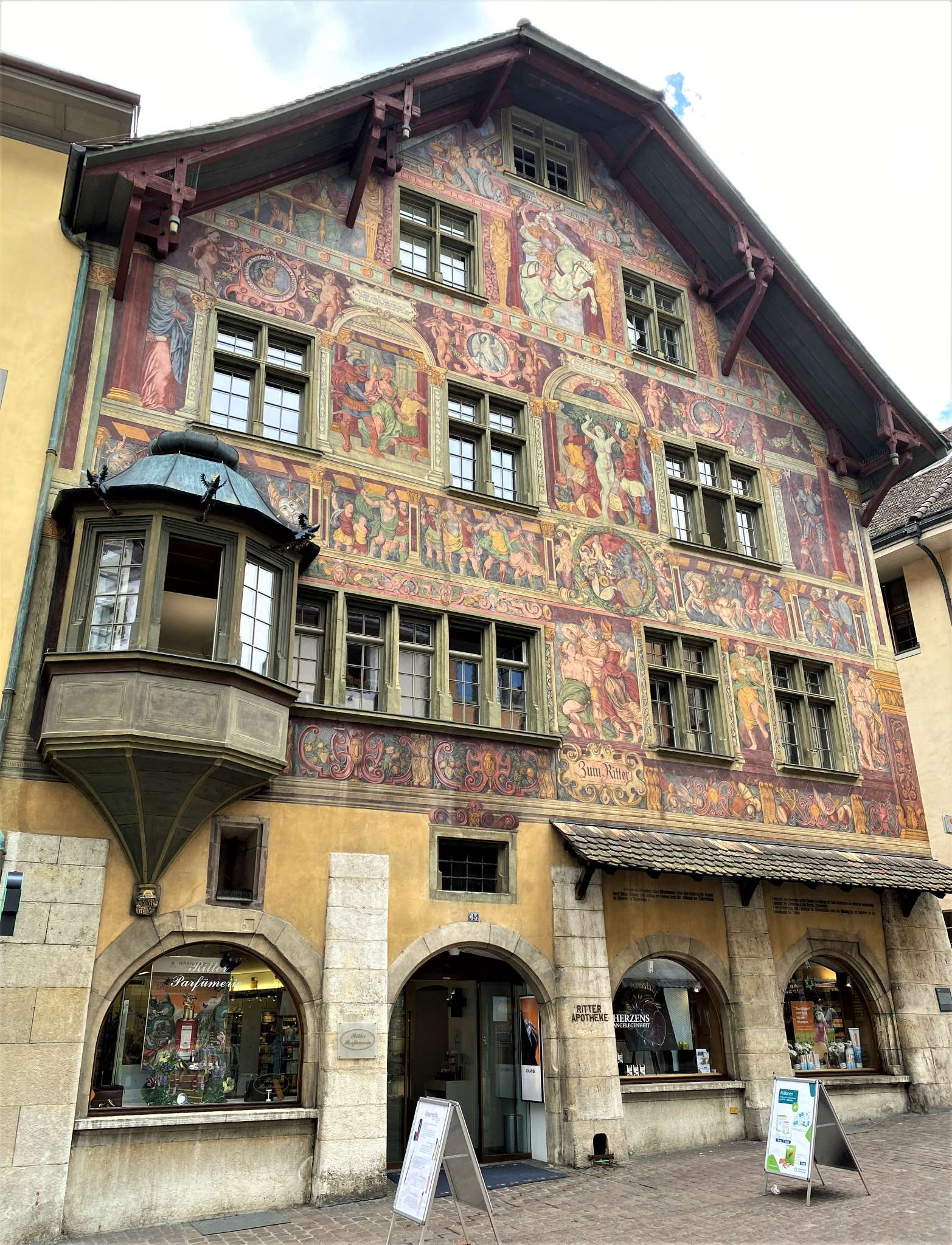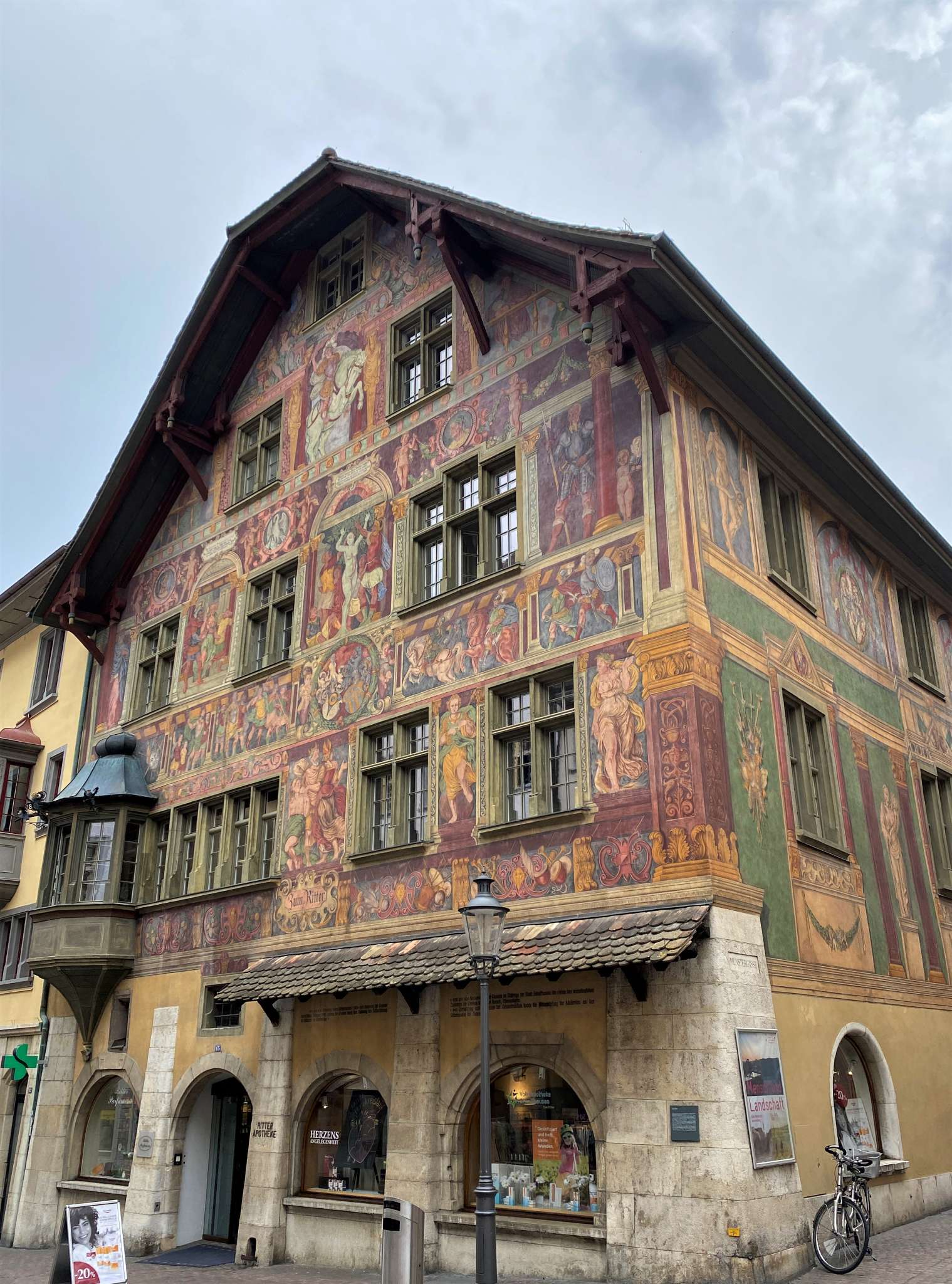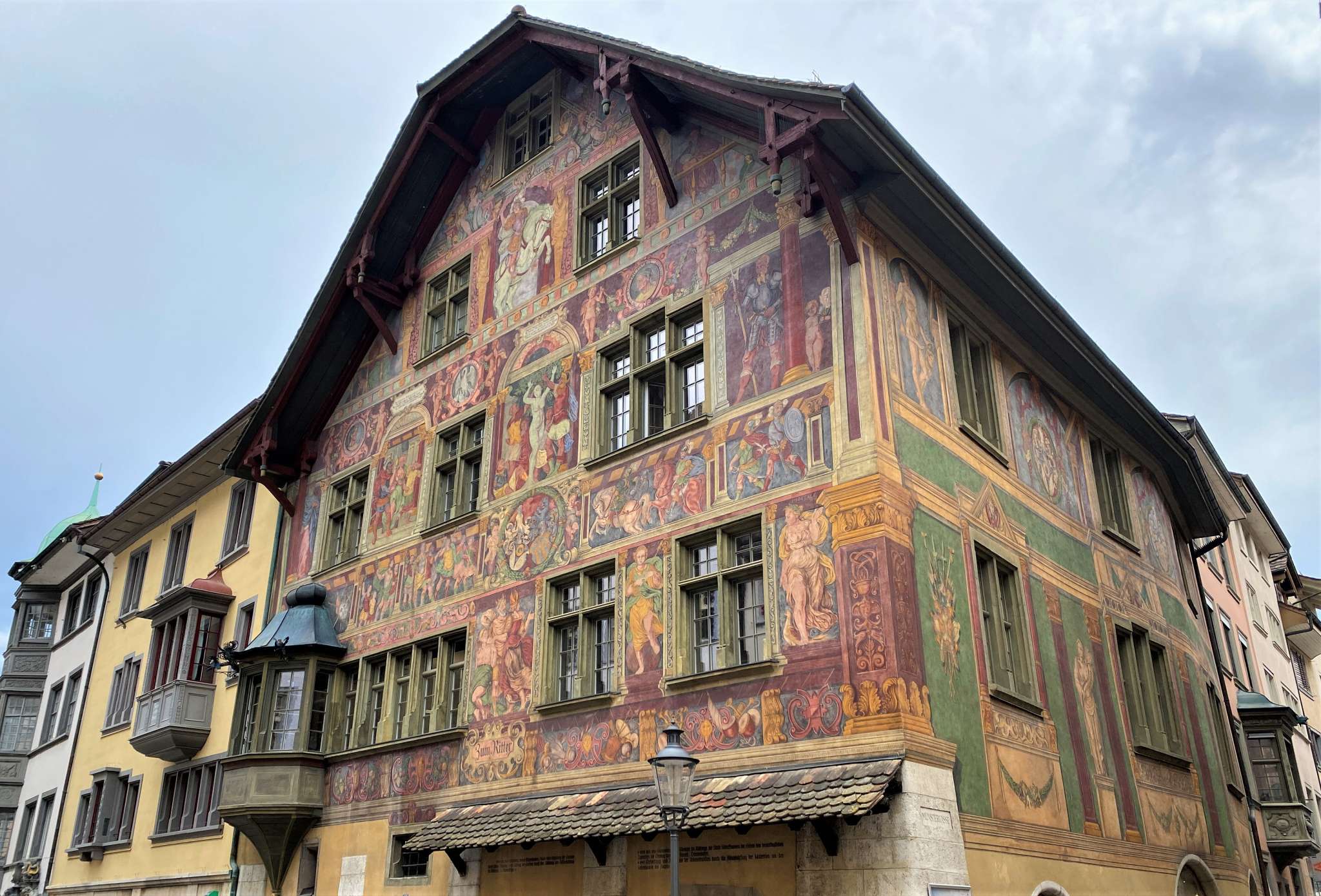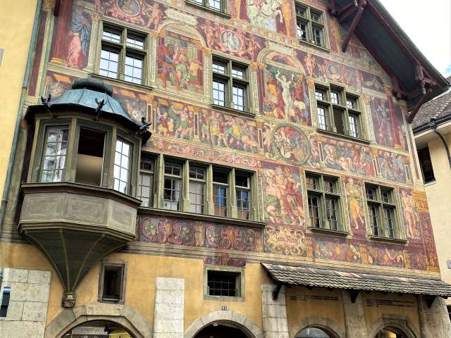 One of the most beautiful Townhous of Switzerland. Rebuilt in 1566 by the Knight Hans von Waldkirch, woh in 1568-70 directed the painting of the fasade by the famous Schaffhausen painter Tobias Stimmer. The most significant Renaissance fresco north of the Alps. The original fresco newly and masterfully re-done in 1943 in the spirit of Tobias Stimmer by Carl Roesch.