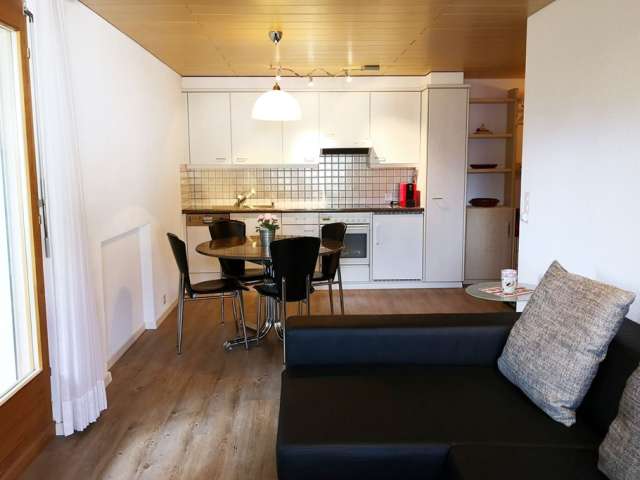 The 2.5-room apartment in the Haus zur Tanne is centrally located in Tannenboden, ideal for skiing, biking, and hiking. You can reach the ski lift in less than five minutes. A large garden seating area offers a beautiful view of the mountains in summer.