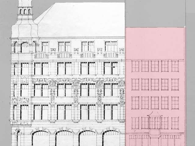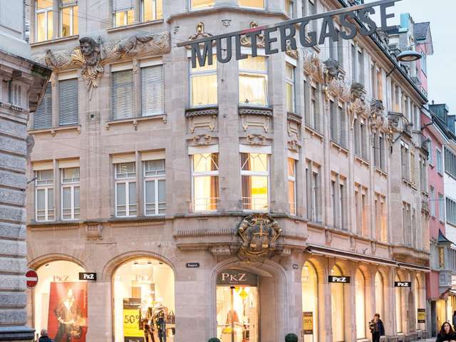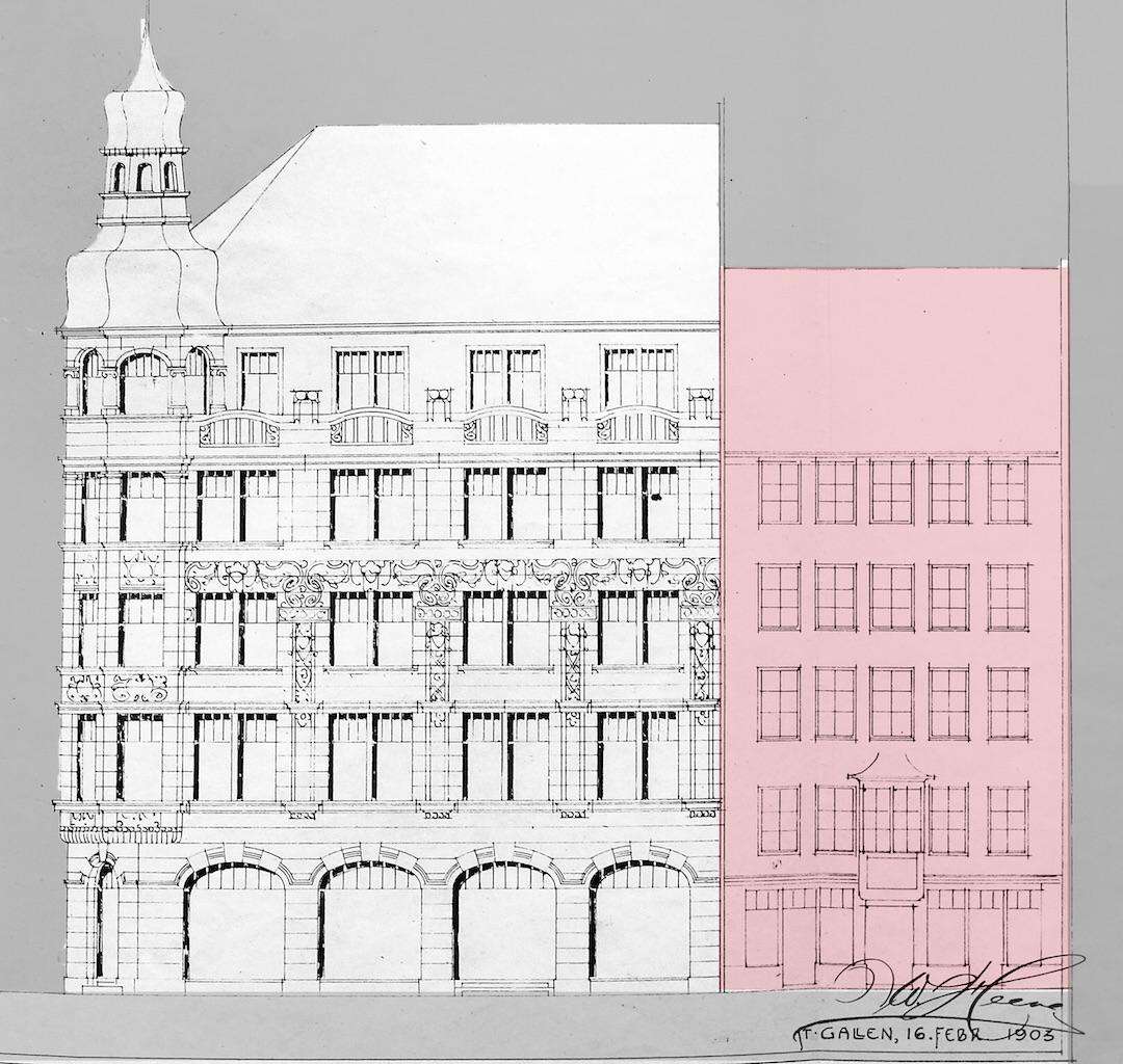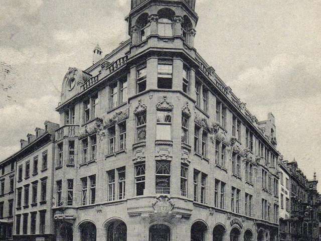 With its five high storeys - the uppermost hidden behind a stone balustrade - Wendelin Heene opened up a new architectural perspective for Multergasse, which experienced a boom as a shopping street after 1900.