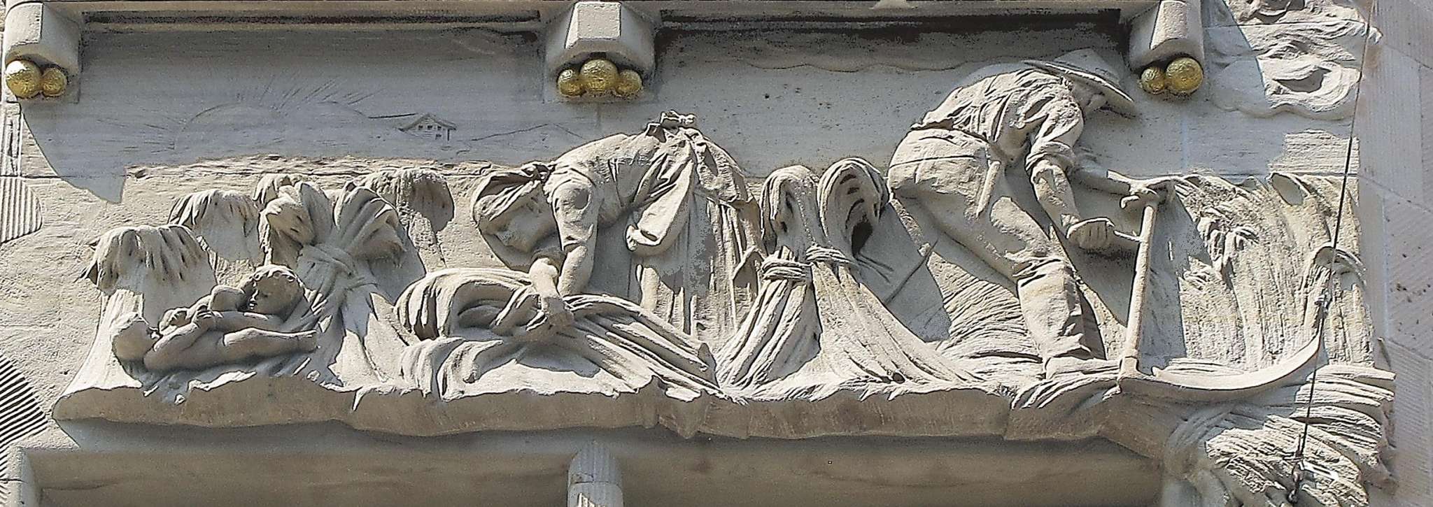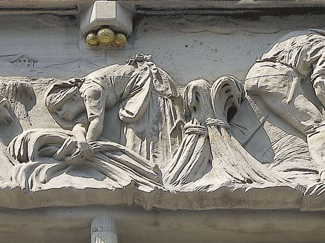 The pillar construction of the scales is covered with a sandstone shell. This is remarkable in its figurative and ornamental modeling. Pilasters grow organically out of the wall and end at the top in the ornamentation of a diamond frieze. The five larger-than-life, fully sculpted sandstone heads representing the five continents are outstanding - masterpieces by the Dutch stone sculptor Henri Gisbert Geene (1865-1950), who was also extremely productive in St.Gallen.