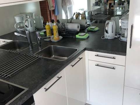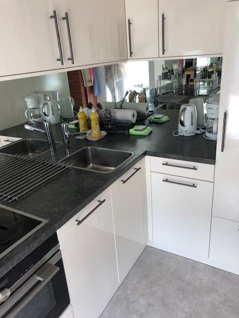The cozy apartment is decorated with a lot of charm and cheerful colors. It has a parquet floor in the living/sleeping area and a tiled floor in the kitchen.