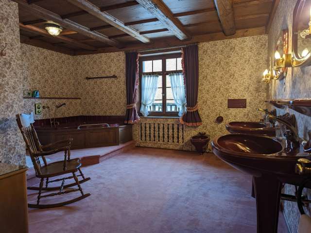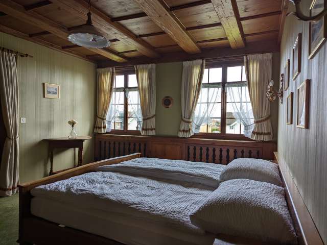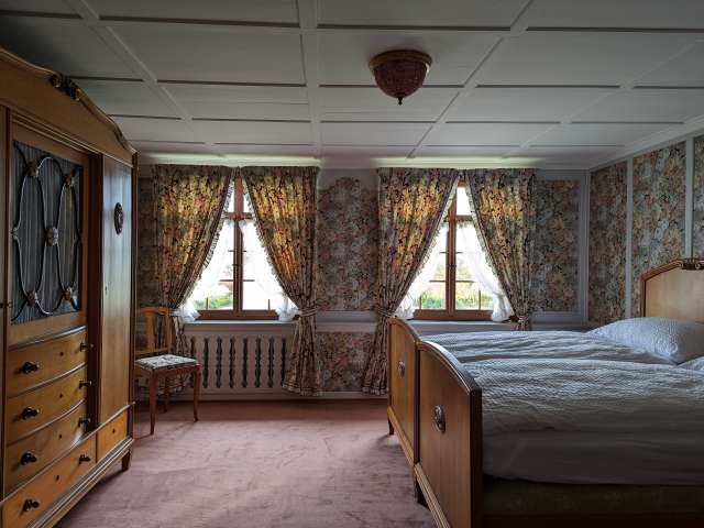 The Schlössli Herrenhof in Langrickenbach was built in the 18th century as the residence of an influential family, but fell into disrepair after several changes of ownership. A family of entrepreneurs from Kreuzlingen bought it and restored it. Today, Schloss Herrenhof is available to guests as an event venue and splendid accommodation. There are five double rooms in the main building, one of which is on the top floor with a view of Lake Constance. The historic potato cellar is suitable for celebrations such as weddings or birthday parties with a special ambience. A huge fireplace (barbecues are permitted) and historic furnishings with lots of wood create a cosy, rustic atmosphere. A gaming room with table tennis, billiards and other games as well as a huge garden with a gas barbecue and plenty of privacy complete the recreational fun. The adjoining building offers space for ten additional guests in a mass sleeping area. The hosts live on the ground floor. Nevertheless, 600 square metres remain in the Schlössli for the exclusive use of the guests.