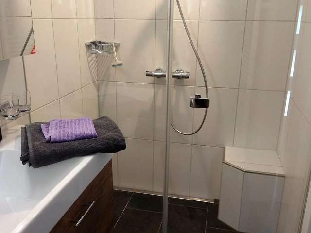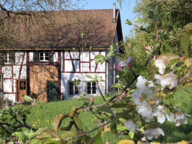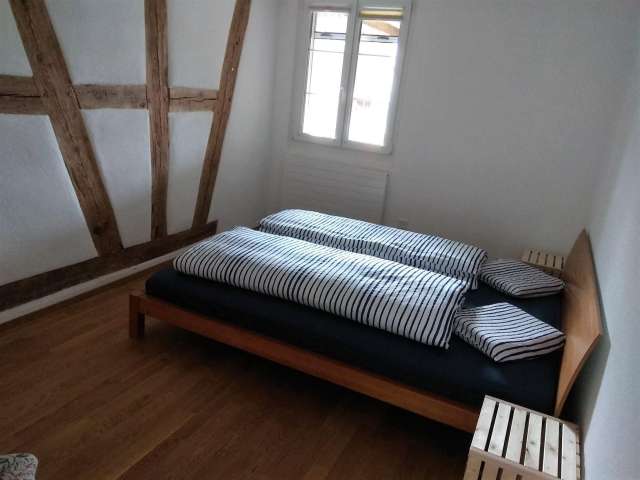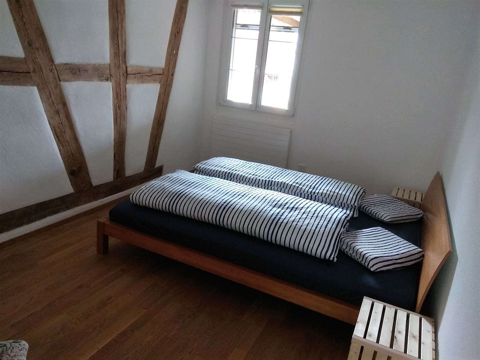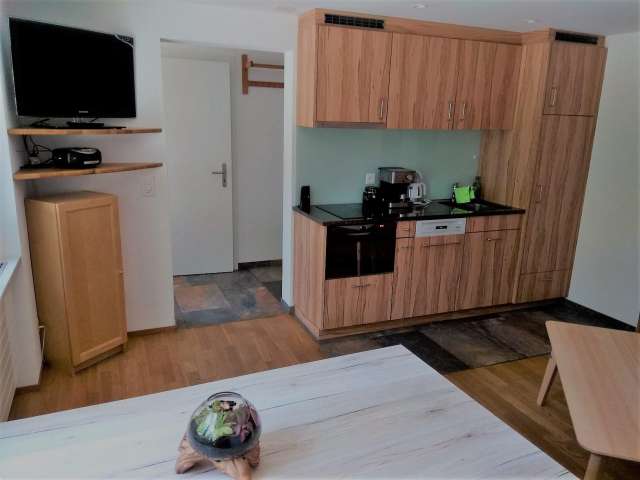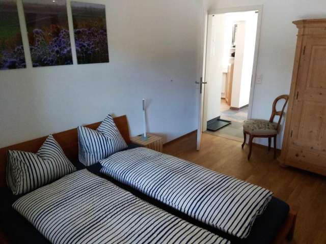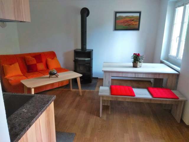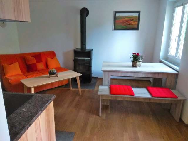 Small 2-room holiday flat in Siblingen. We also offer breakfast on request. The smart flat has everything you need, kitchen (with oven, coffee machine, kettle), bathroom, bedroom for 2 persons, living-dining room with a sofa bed for 2 persons. There’s also a small, enclosed garden area with table and chairs.