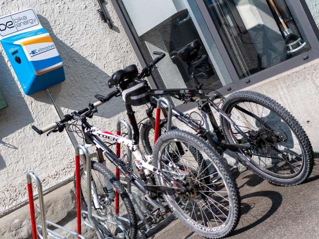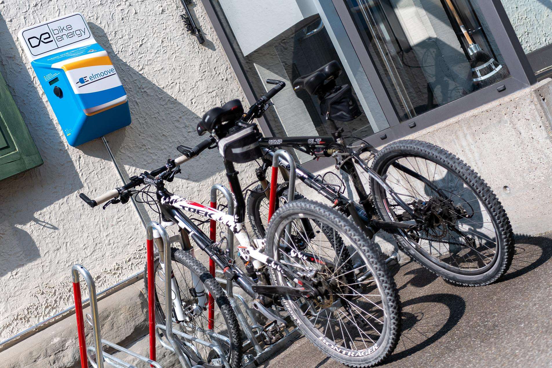 modern charging station for e-bikes as well as a lockable bicycle garage with a small workshop (bicycle tools, compressor, ...) including the possibility to store shoes and bicycle equipment as well as the possibility to clean the bicycle are available.
