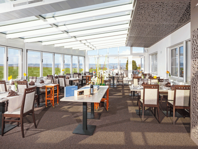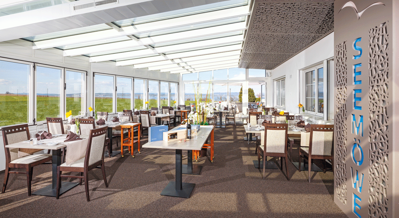 The restaurant of the Hotel Seemöwe, situated on a hill and with an impressive view of meadows and Lake Constance, convinces with its varied offer. Thanks to its large banquet hall and well-tended garden, the Seemöwe is also the right choice for parties.