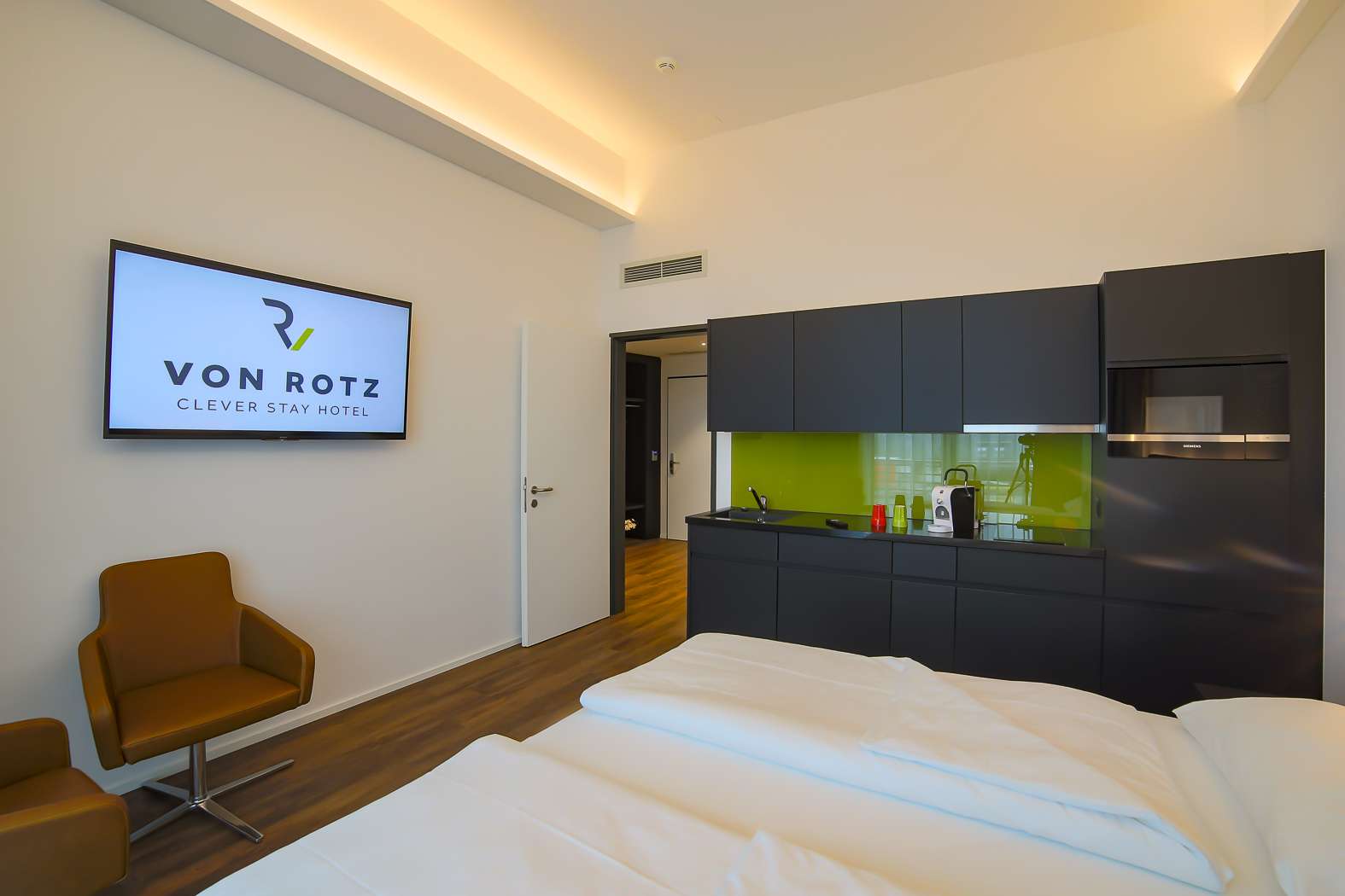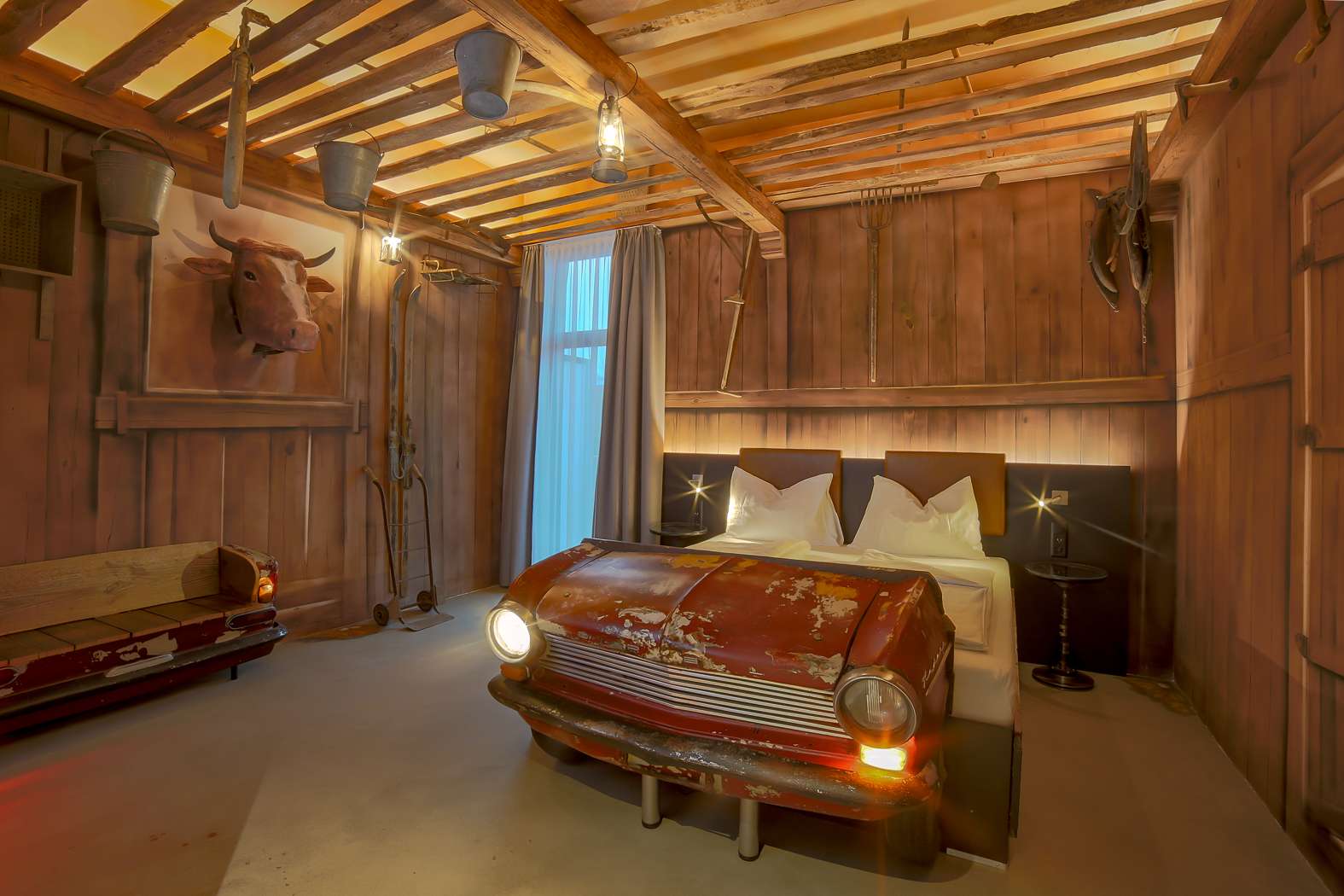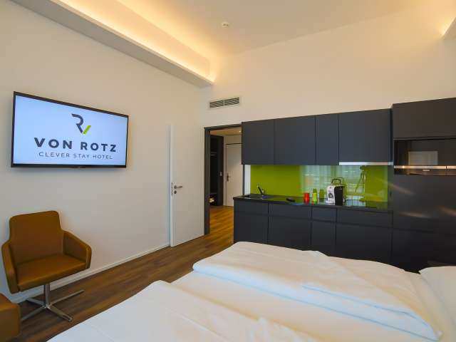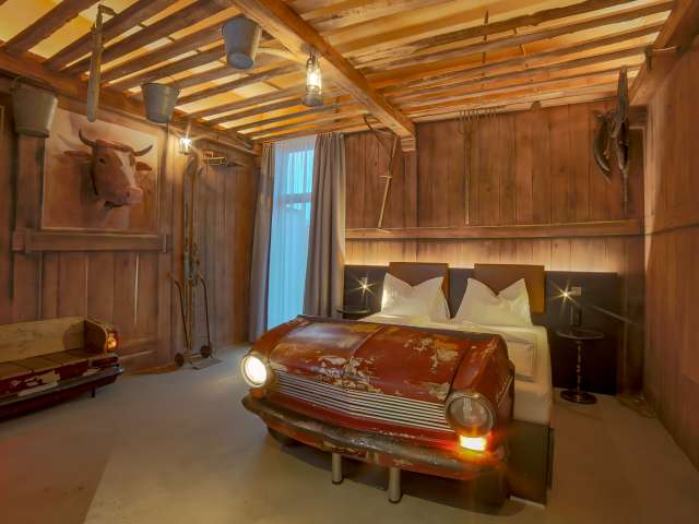 The hotel is located directly on top of a car dealership, the well-known car world of "von Rotz", and offers comfortable rooms for business people, long stay apartments with a small kitchen, individual theme rooms on the theme of "Cars & more" and a spacious family room.