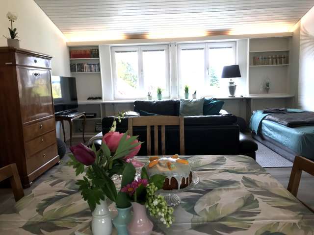 The beautiful attic holiday flat is centrally located in a quiet neighbourhood of detached houses in Arbon. The lake, the old town, museums and shopping facilities are all within easy walking distance.