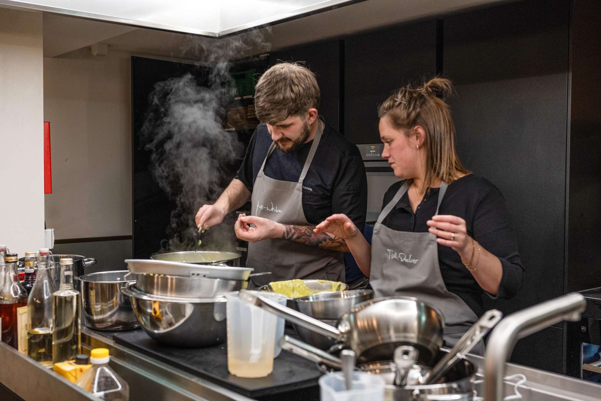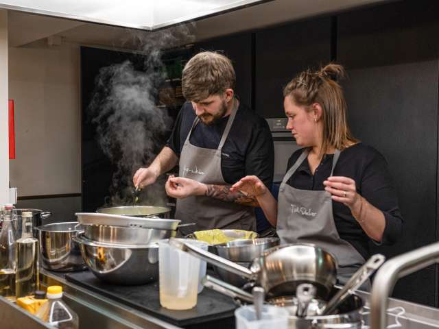 A dinner with friends and guests without the stress of preparation - sounds like a relaxed evening. And because the best conversations take place in the kitchen anyway, we start with an extensive aperitif platter. The culinary highlight is the jointly prepared Italian-style tavolata. The evening ends with coffee and a bottle of digestif right on the table. 3-course menu with aperitif and canapés, wine while cooking and eating, water, coffee/tea and digestif CHF 145 / person incl. VAT. Bookable daily from 6 to 30 persons