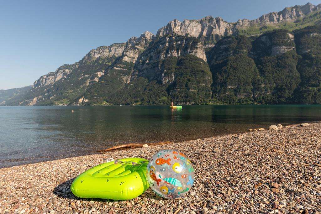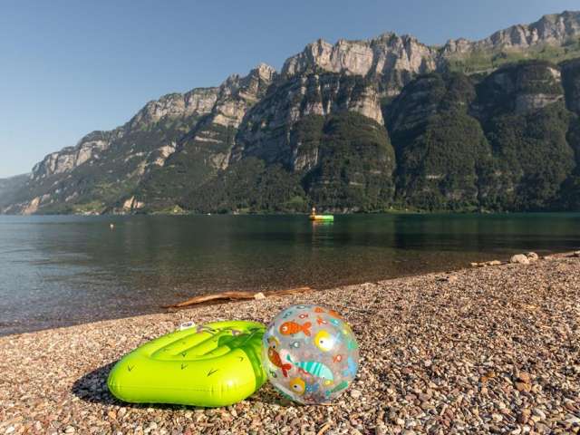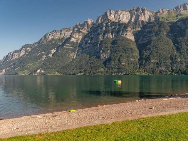 The Unterterzen beach at Lake Walen offers an extensive sunbathing lawn, a beach kiosk, and a pebble beach. Water sports enthusiasts can rent kayaks or SUP boards. Changing rooms and toilets are available.