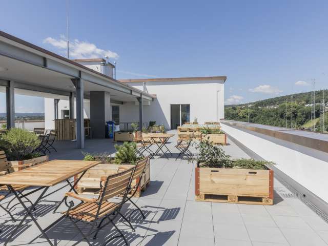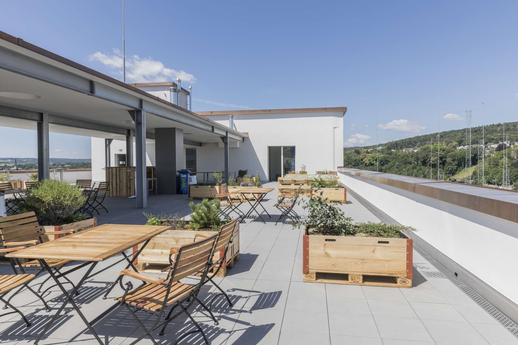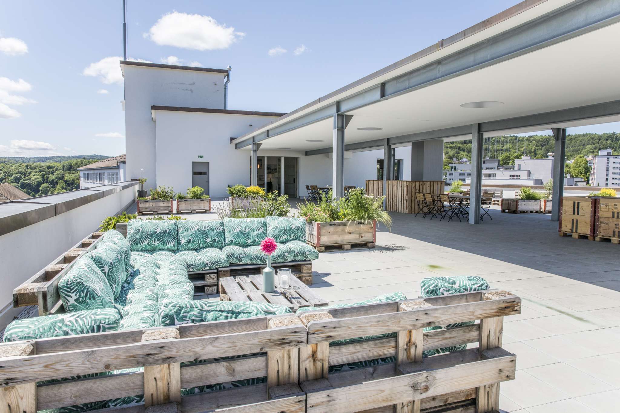 With its three comfortable rooms and modern flair, the self check-in mini-hotel on the SIG site at the Rhine Falls offers exceptional accommodation directly above the Rhine Falls. A special highlight: guests staying here have direct access to a cozy lounge and the huge roof terrace on the fifth floor. On the first floor of the mini-hotel is the Grünerbaum restaurant with a spacious outdoor terrace. The Co-Work and a gym are also just a short walk away.