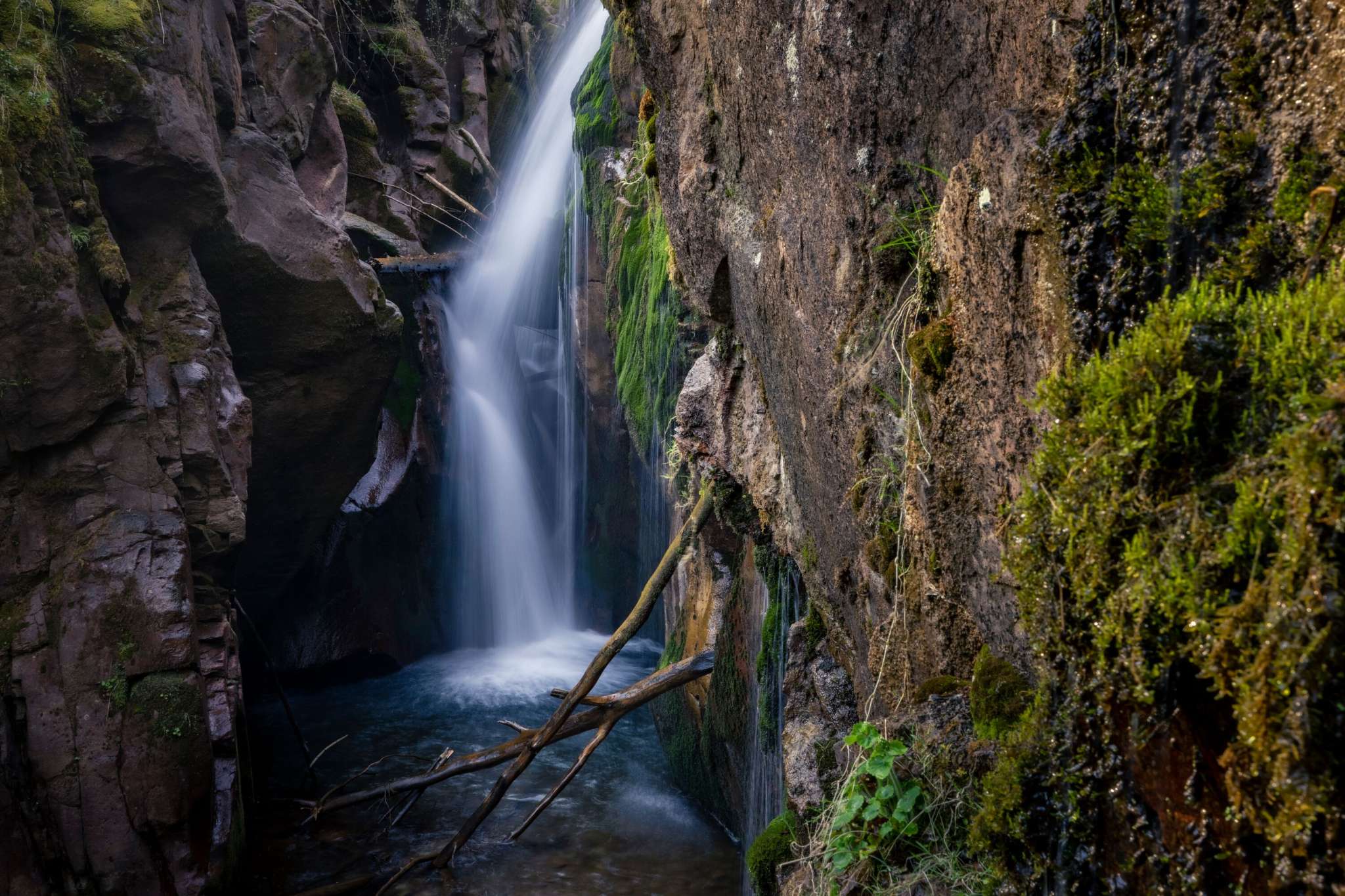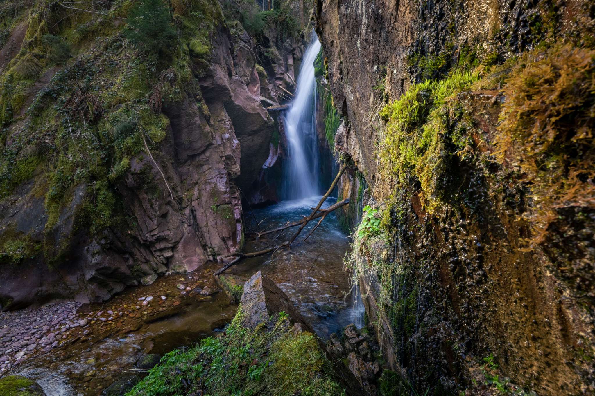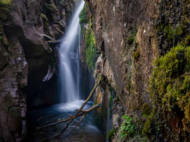 The Murgbach Waterfall impresses with red Verrucano stone and a green environment. It is located in the largest chestnut forest north of the Alps and can be reached via the Chestnut Trail in 30 minutes.