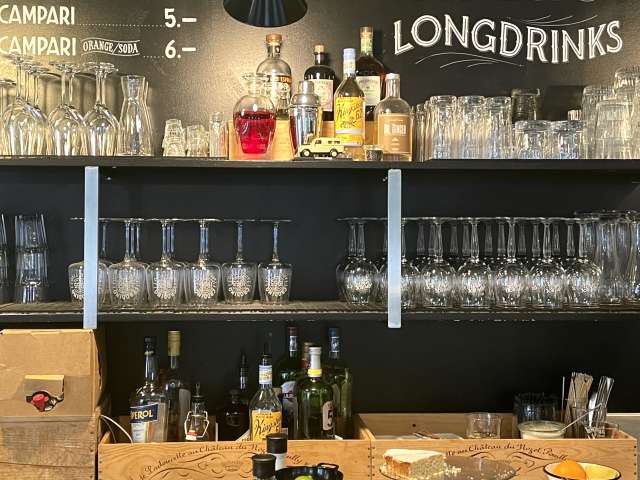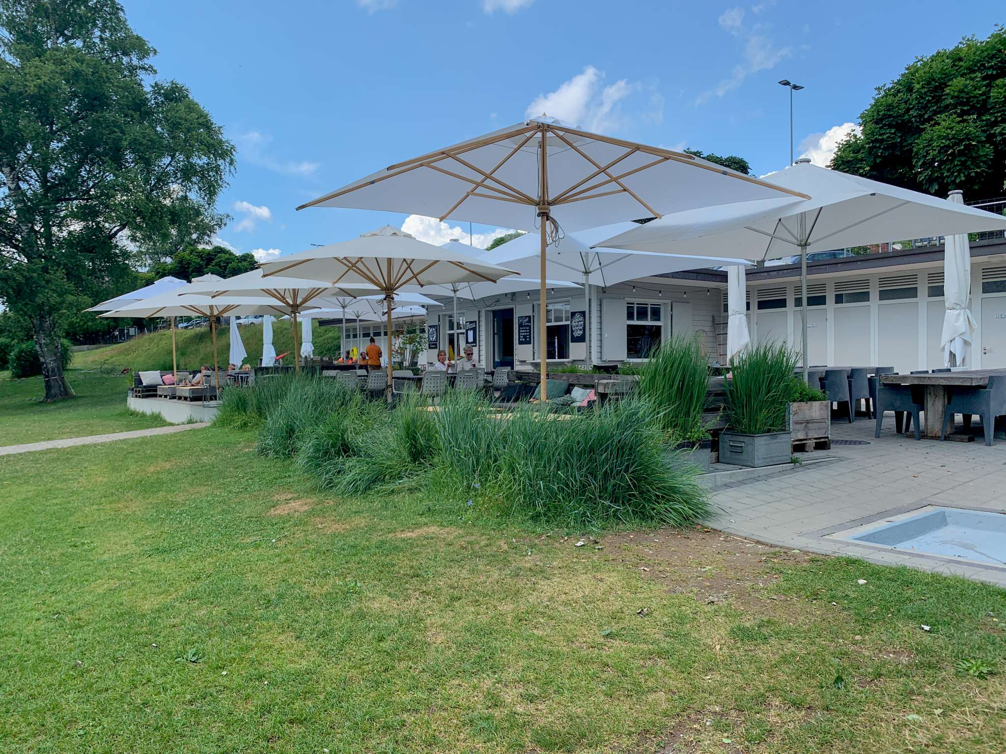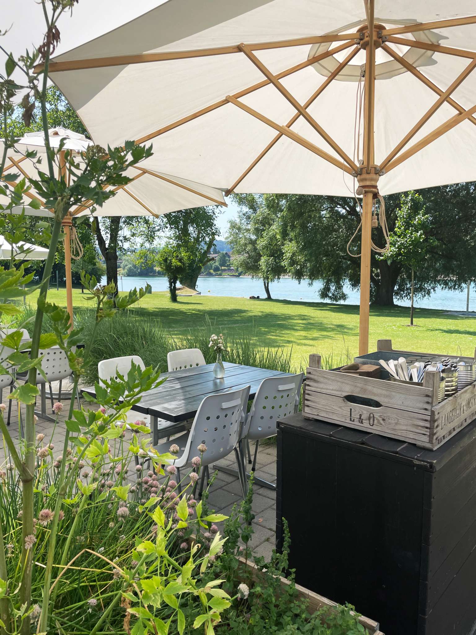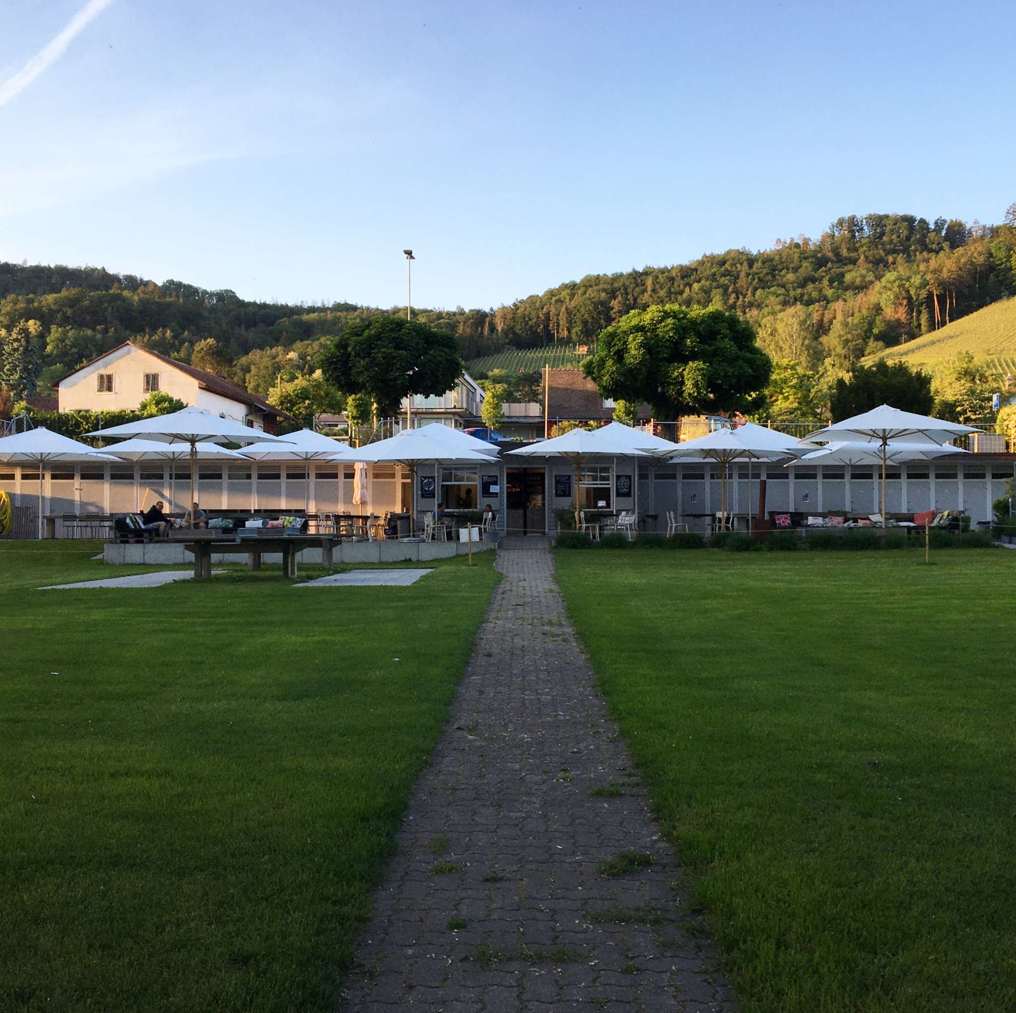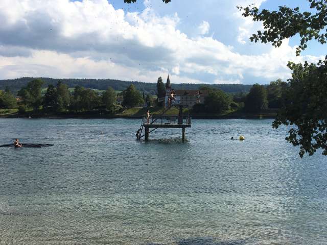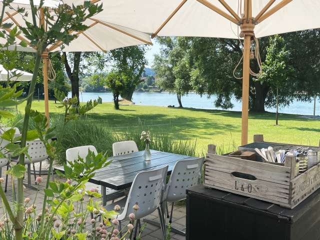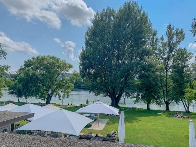 Lido with a large bathing lawn directly on the Rhine and old trees with children's playground, children's paddling pool with sun awning, diving tower (only accessible with bathing supervision - at weekends and during the summer holidays), volleyball court as well as the café "Uferlos" with many delicacies and a special ambience.