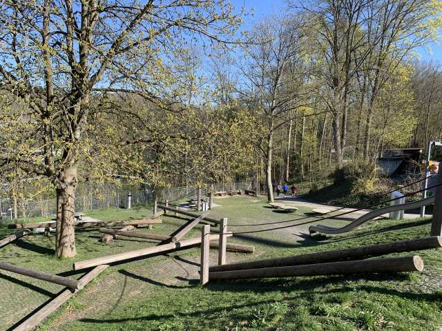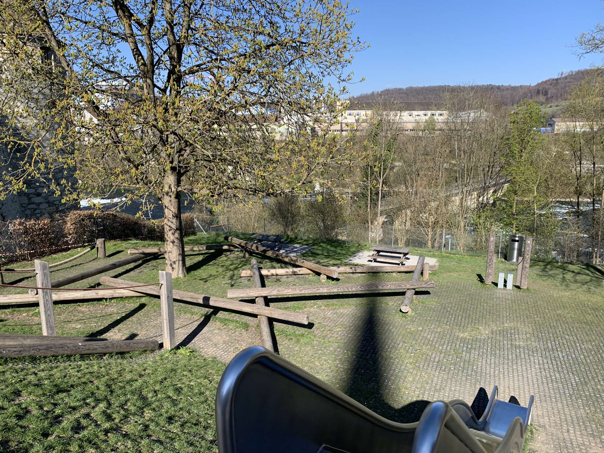 A small playground with a slide, climbing ropes and balance beams at Schloss Laufen invites you to let off steam.