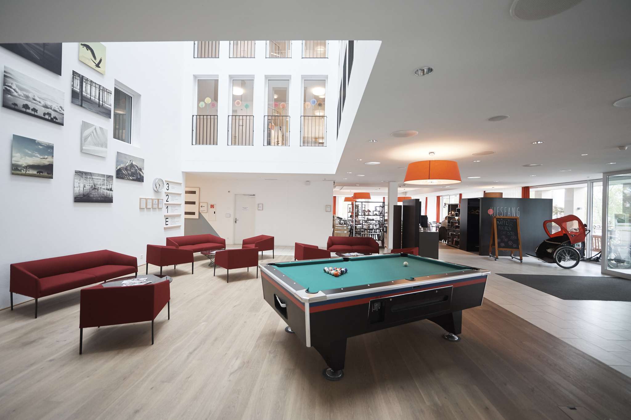 The Restaurant Kiesfang, an interplay of modern architecture, rural down-to-earthness, traditional meeting place and openness. It is located in the middle of Sarganserland at the tranquil Kiesfang pond and the adjacent playground. The restaurant is part of the public section of the Novellas Generation house.