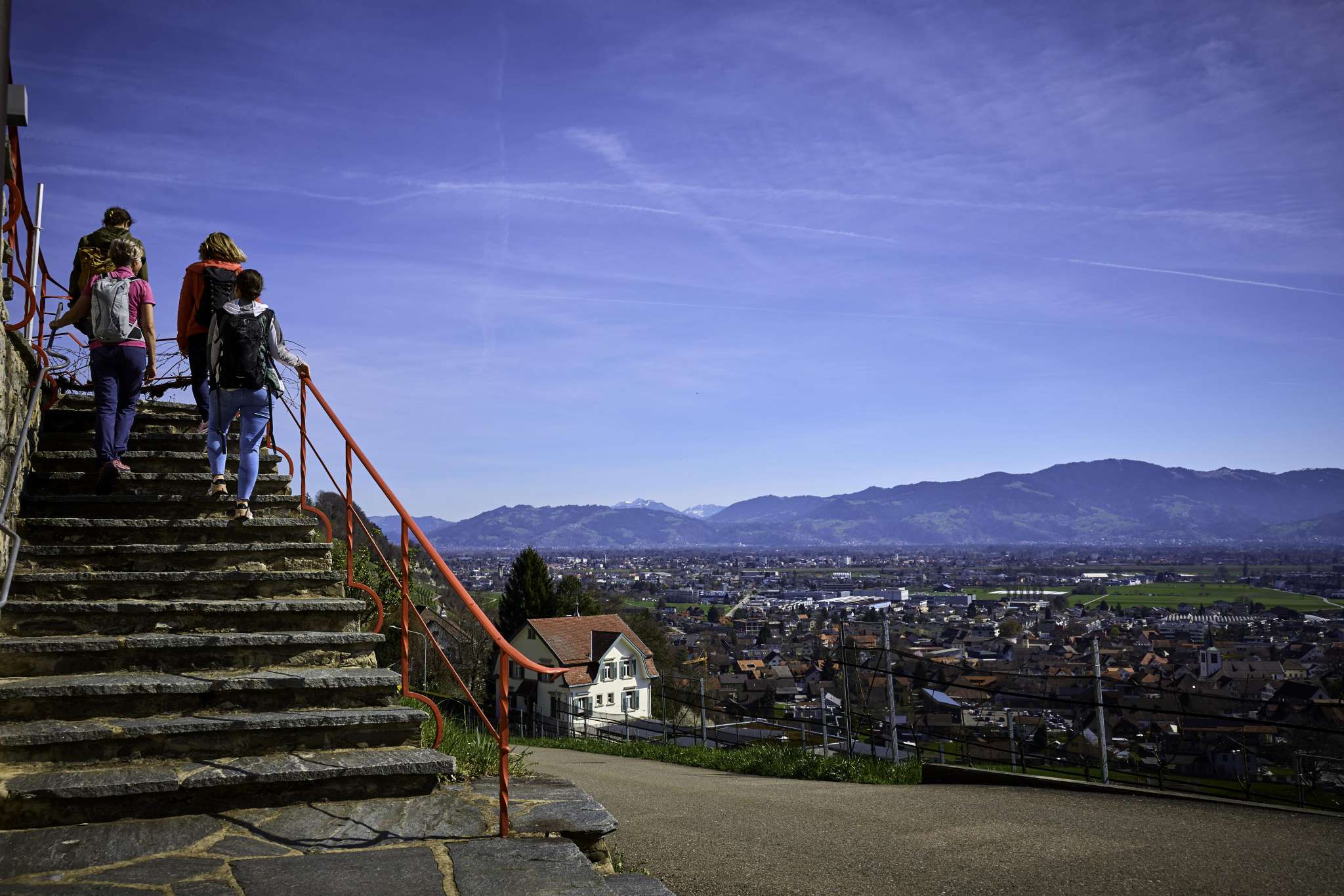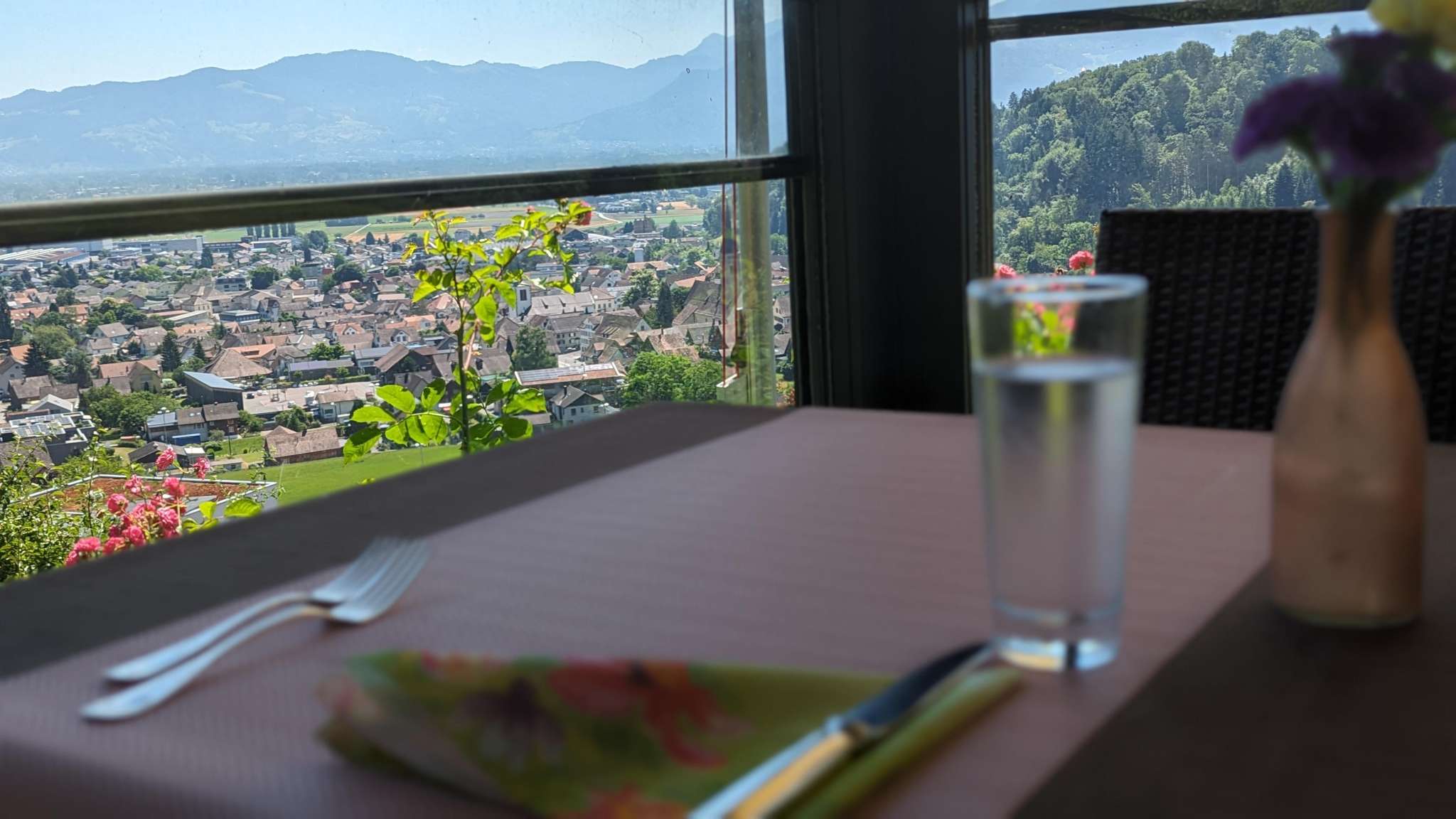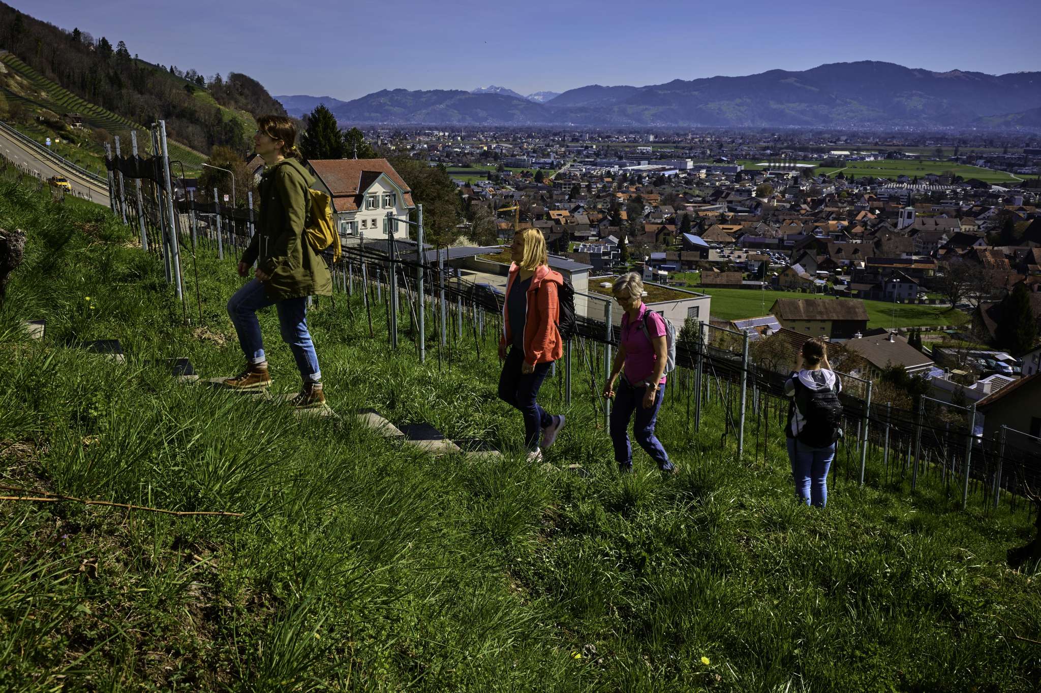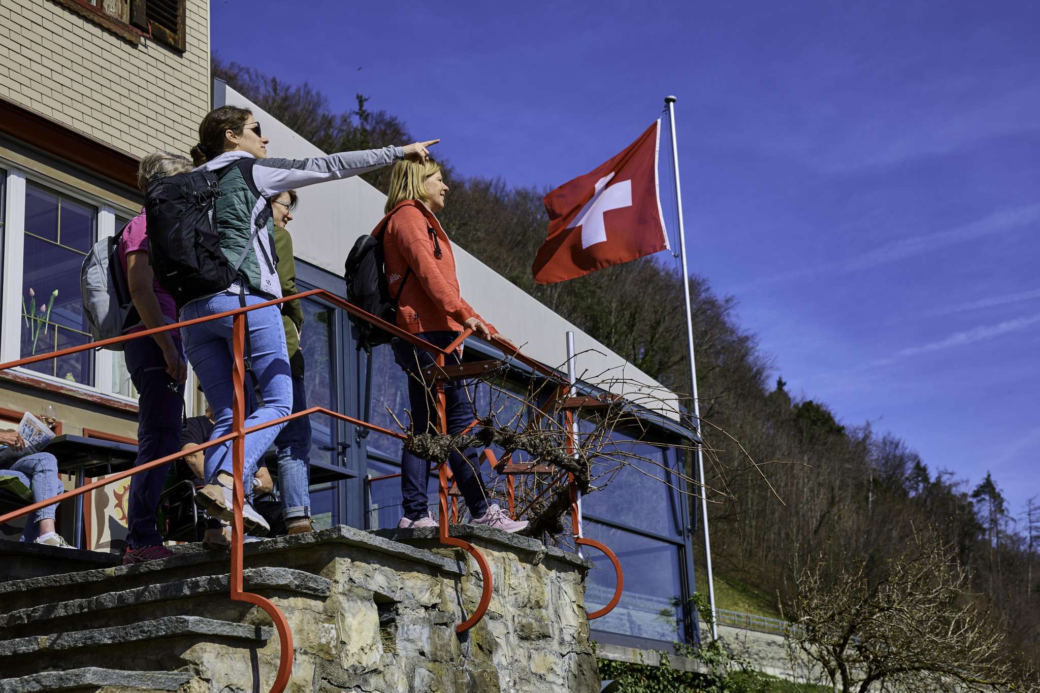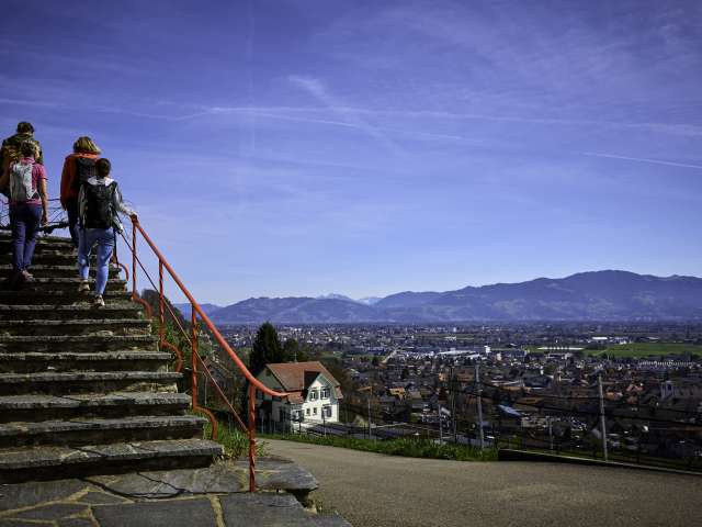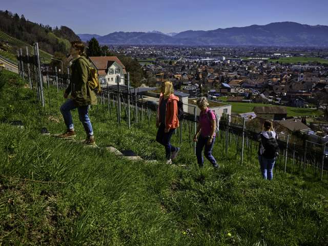 Eating and drinking in the middle of the vineyards with a beautiful view of the St.Gallen Rhine Valley.