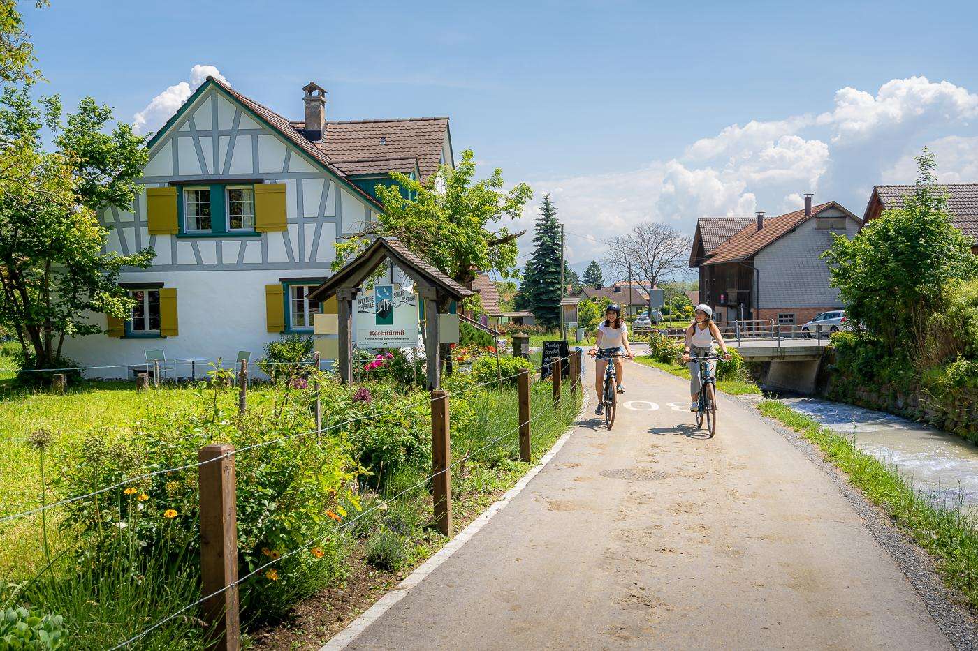 The easily accessible “Rosentürmli” farm is a renovated timber-framed building with tower and is classified as a protected historical landmark. It is located on the outskirts of the village of ThaI at the foot of the large vineyard where excellent climate conditions are prevalent. The farm has a dairy and grows fruit and different crops, and wine from the farm’s own vineyards is stored in the vaulted cellar. The farm teems with life including cows, calves, ponies, horses, rabbits, chickens, cats and the farm dog Böhnä together with the six-person family.