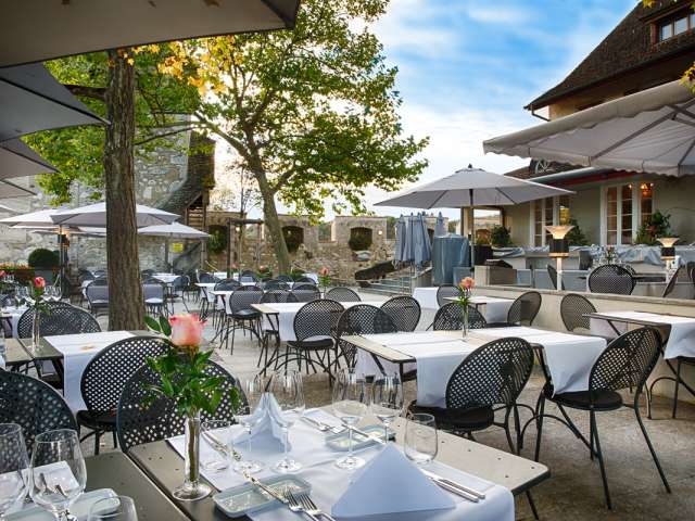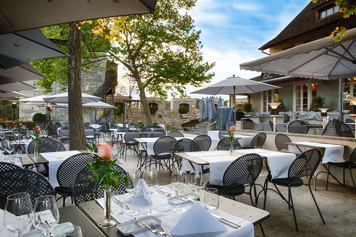In the daytime restaurant "Castello", the former banner hall with its cosy fireplace and the large terrace create an atmospheric setting. Enjoy delicious specialities with a focus on regionality and seasonality in a setting steeped in history. In the "Bleulersaal" you will be spoilt with culinary creations in the evening. The evening illumination of the Rhine Falls rounds off the experience.