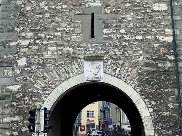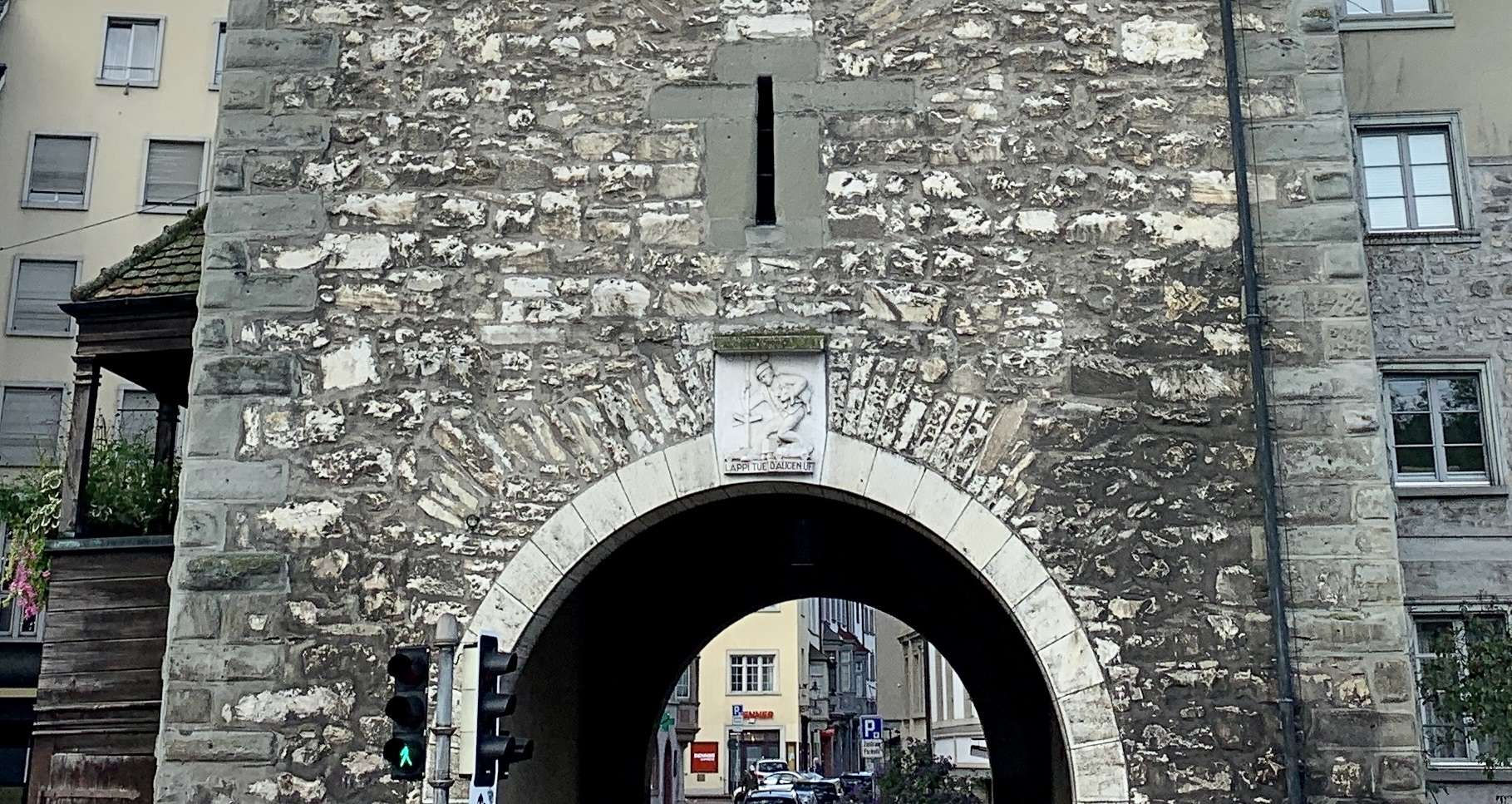 "Open your eyes you dumbbell", is the saying by the painter, Arnold Oechslin, which was emblazoned on the keystone of the north facing archway in 1935 and which is famous well beyond Schaffhausen. The town councillor selected the design from four proposals. There is no historical connection between the saying and the Schwabentor.