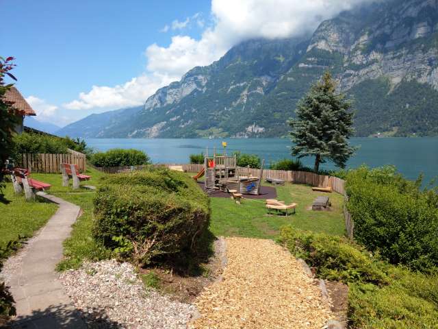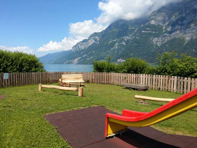 You can become a captain yourself on this playground: at the steering wheel of the small wooden ship with balancing ropes, slide and wobbly bridge. The small merry-go-round makes the world spin a little faster, you can test your balance on the slackline, explore the horizon through telescopes and gather new strength on tree trunks. The slide takes children quickly off the ship. Parents can watch the children play on wooden benches or enjoy the view of Lake Walen.