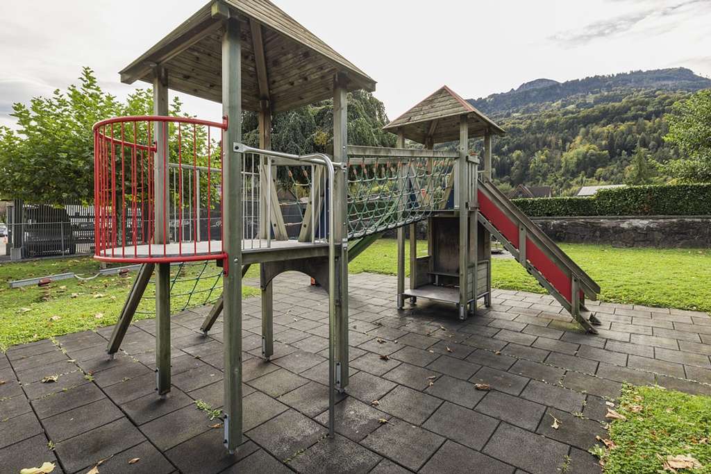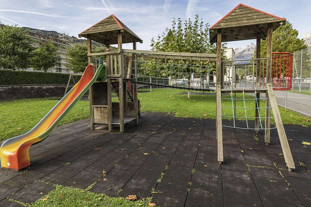 The playground at the Flums retirement home offers two play towers with slides and climbing elements, swings, a spinning wheel, balancing bars, and a sandbox. Children can develop their motor skills and experience adventures here.