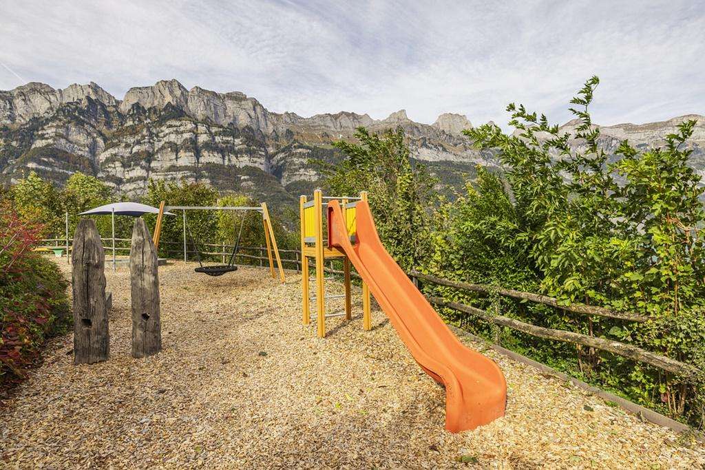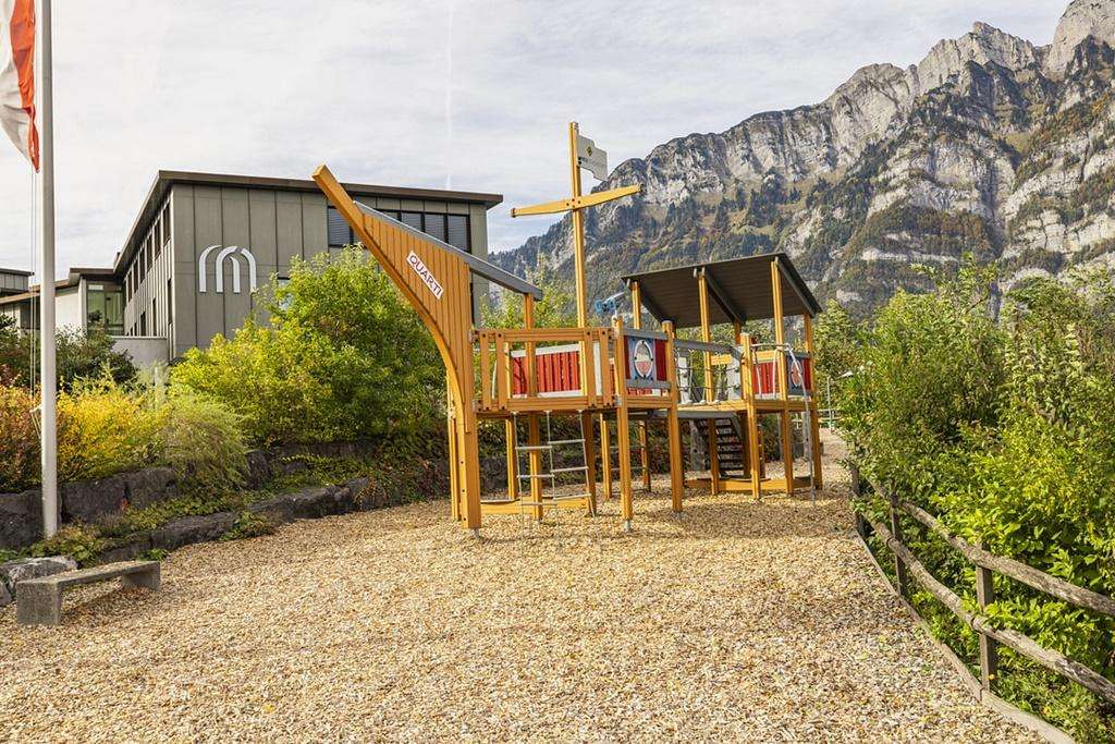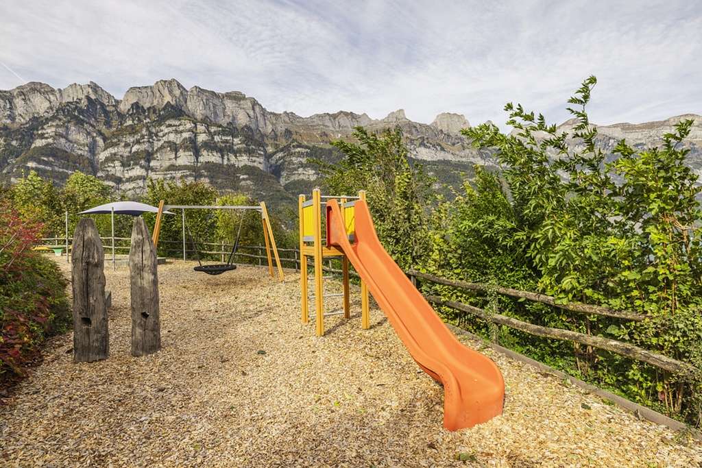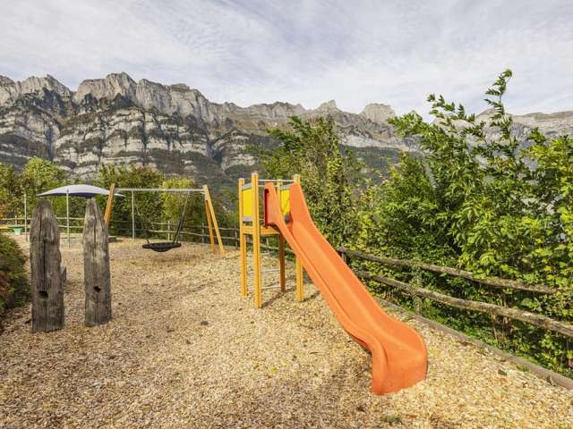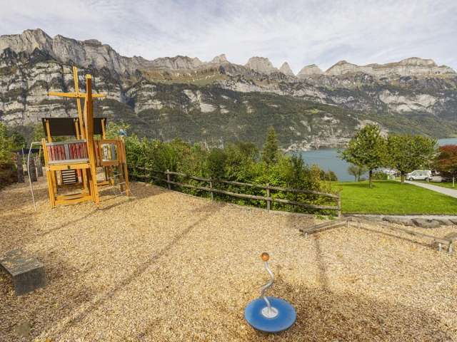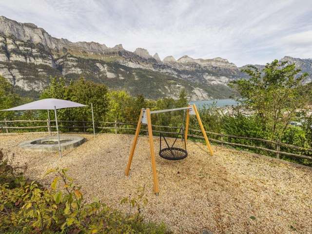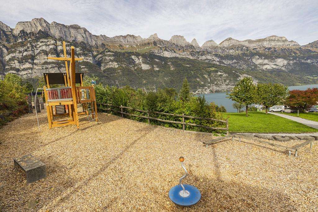 The playground at Restaurant Neuschönstatt in Quarten offers families and children a chance to let off steam after a meal. Attractions include a climbing tower, a hammock swing, a sandbox, and a slide.