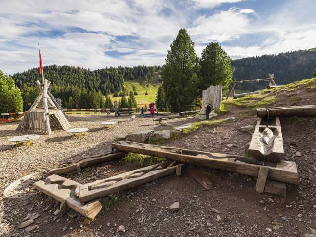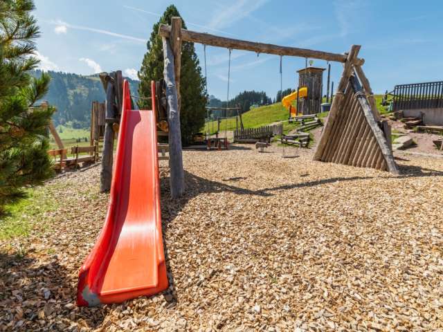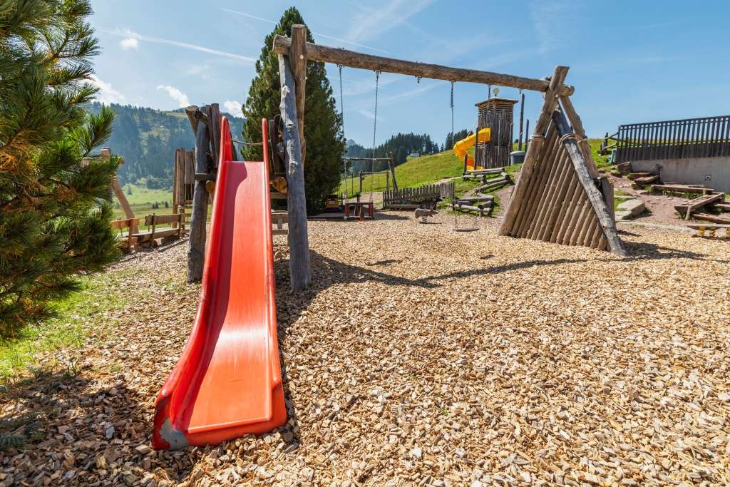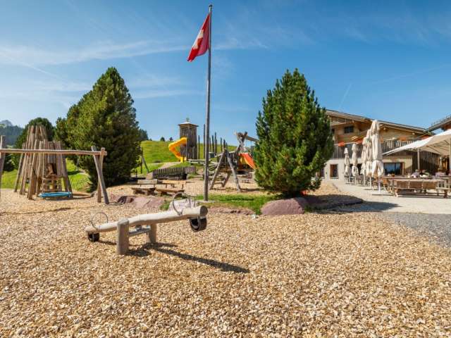 The playground at the Sennästube restaurant in Flumserberg Tannenboden offers numerous activities for children, including a zipline, a trampoline, and a circular slide. It is located right next to the restaurant terrace and is ideal for families.