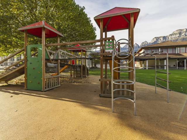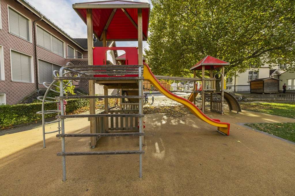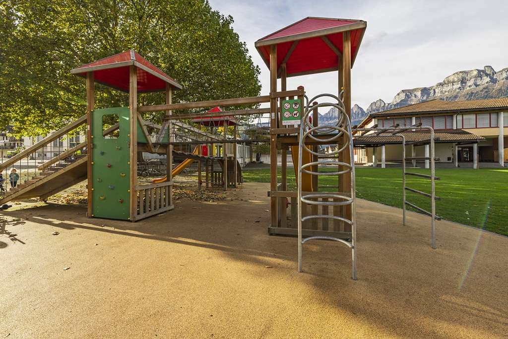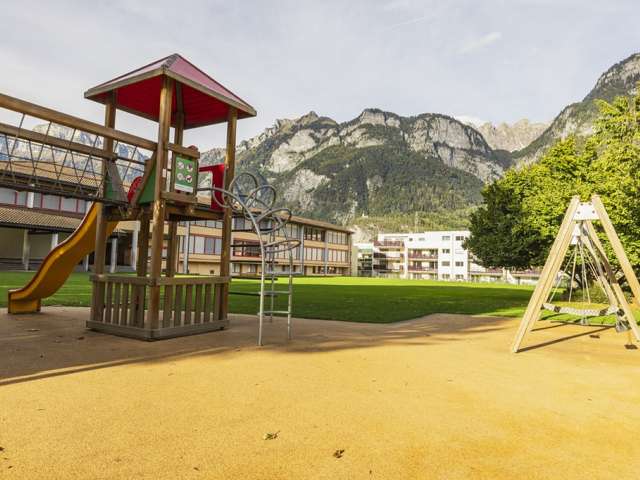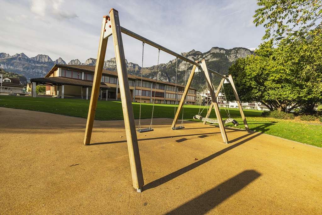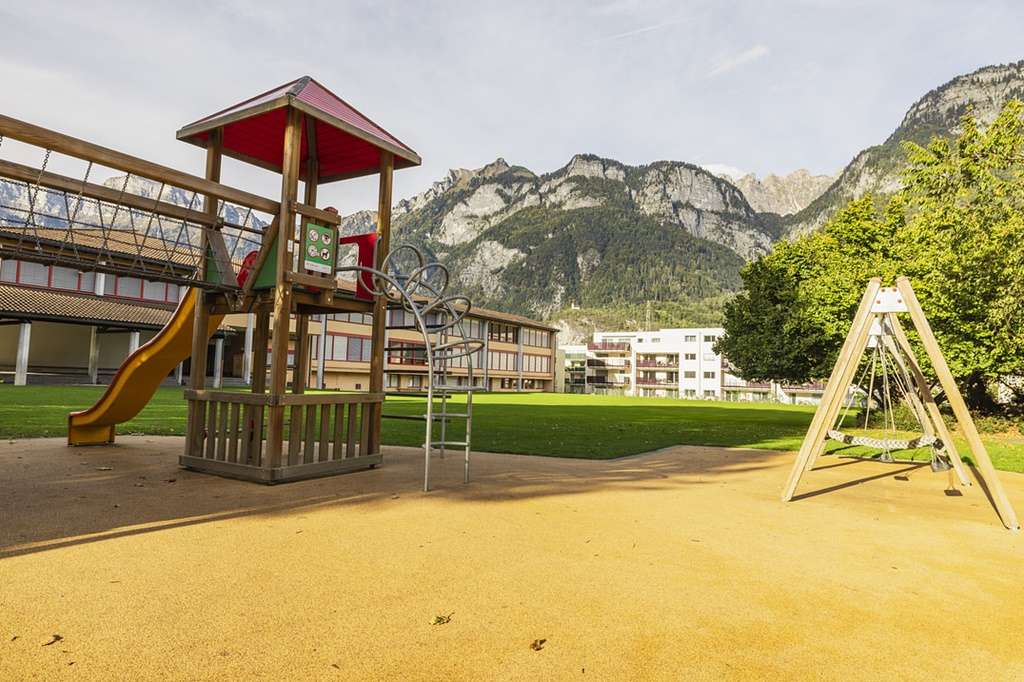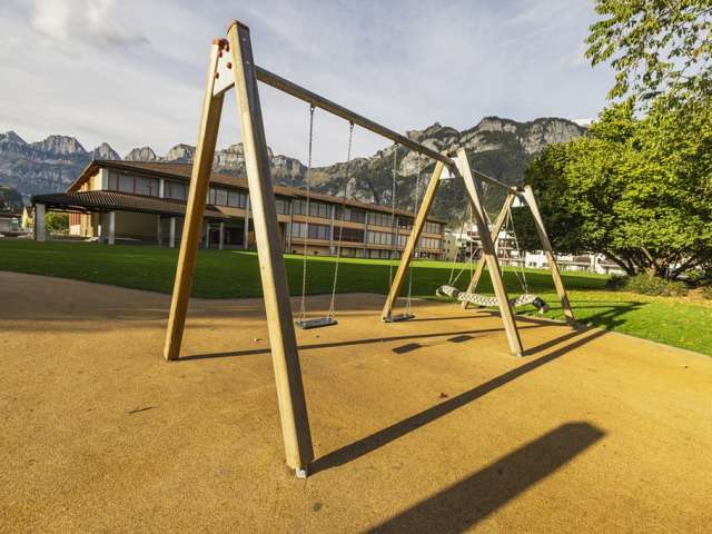The playground at Flums School offers three towers with climbing elements, two slides, and several swings. An ideal place for children to test their skills and experience new adventures.