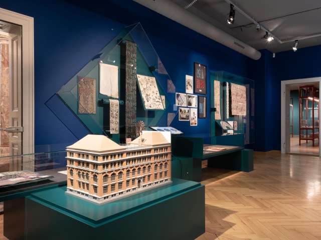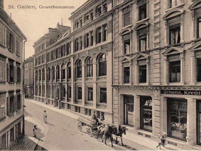 From 1863, the “Kaufmännisches Direktorium St.Gallen” regularly acquired fabric samples from all over the world and displayed them in a sample room for the regional textile industry to view. Finally, in 1878, the “St.Gallen Industrial and Commercial Museum” was founded, giving rise to the need for a building of its own. This was completed in 1886 in a palatial historicist building on the former Seidenhof site in Vadianstrasse. In addition to the collections of the “Kaufmännisches Direktorium”, the museum housed the textile library, the drawing school and, from 1890, the embroidery school. At the same time, a platform was created for the presentation of aesthetic innovations and inspiration through design. In 1982, the museum was renamed from “Industrie- und Gewerbemuseum” to Textilmuseum St.Gallen. Since 1900, more and more temporary exhibitions have been held, with the St.Gallen Textile Museum being able to draw on important private collections and company archives that have been acquired over the decades. They complement the original sample collections with valuable historical textiles that were once used by textile industrialists as models for their own production and are still among the highlights of the museum's collection today.